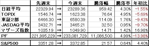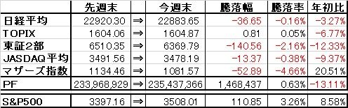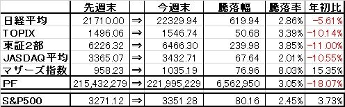 取引・なしPF(保有銘柄21銘柄)【現物】・2221 岩塚製菓×3,000株 (@3,762→3,456) 時価3,665▼5 [PER12.8][PBR0.39]・3001 片倉工業×10,000株 (@1,253) 時価1,167▼20 [PER25.4][PBR0.26*]・3447 信和×7,000株 (@724) 時価694▼1 [PER12.3][PBR0.74]・3504 丸八HD×32,400株 (@745→623) 時価670▼2 [PER14.0][PBR0.23]・3537 昭栄薬品×6,000株 (@567) 時価942△2 [PER18.3][PBR0.41]・4659 エイジス×3,000株 (@1,951) 時価2,572△22 [PER8.2][PBR1.33]・6222 島精機製作所×6,000株 (@1,396) 時価1,457▼1 [PER-][PBR0.48]・6396 宇野澤組鐵工所×2,500株 (@2,119) 時価2,280△22 [PER22.9][PBR0.20*]・7453 良品計画×5,000株 (@1,146) 時価1,537△16 [PER-][PBR2.09]・7485 岡谷鋼機×1,000株 (@9,376→7,752) 時価8,650△40 [PER5.6][PBR0.40]・7932 ニッピ×2,000株 (@3,987→2,929) 時価3,565△65 [PER2.4][PBR0.22*]・8293 ATグループ×8,000株 (@1,646) 時価1,286▼4 [PER14.4][PBR0.21]・8591 オリックス×8,500株 (@1,524→1,440) 時価1,313.5▼2.0 [PER-][PBR0.56] ・8595 ジャフコ×2,000株 (@2,694) 時価4,125▼30 [PER14.8][PBR0.63] ・8802 三菱地所×14,000株 (@1,791) 時価1,668.5▼38.5 [PER20.3][PBR0.38*]・9020 東日本旅客鉄道×1,500株 (@7,168) 時価6,673▼103 [PER-][PBR0.56*]・9022 東海旅客鉄道×1,500株 (@18,154→12,523) 時価14,865▼180 [PER-][PBR0.78]・9699 西尾レントオール×4,000株 (@2,894→2,772) 時価2,214▼53 [PER10.6][PBR0.62]・9734 精養軒×10,000株 (@901→826) 時価798ケ [PER-][PBR0.28*]・9793 ダイセキ×3,000株 (@1,866) 時価2,411▼37 [PER18.7][PBR1.47]・9984 ソフトバンクG×1,500株 (-) 時価6,326.0▼97.0 [PER-][PBR0.49*]【信用】・8802 三菱地所×10,000株 (@1,576) 時価1,668.5▼38.5 [PER20.3][PBR0.38*] ※ほか株主優待目的で27銘柄保有【年間予想受取配当額】(税引前) 4,483,000-4,761,000円 (配当利回り2.03-2.16%)【年間受取確定配当額】(税引前) 3,167,050円株式 220,362,750円(94.5%)CP 12,718,979円(5.5%)合計 233,081,729円【年初来最高値】290,545,487円(2/12)【年初来最低値】186,752,552円(3/19)前日比 ▼1,835,800円週次 △11,086,500円月次 △17,649,450円年次 ▼37,866,283円+配当3,147,050円(年初より▼13.98%※配当含まず)☆今日のコメント☆「5日ぶりに反落」【保有銘柄動向】 日経平均株価は小幅ながら4日続伸。保有銘柄はやや軟調な銘柄が多く、これまで上昇が続いたJR東海、JR東日本、三菱地所などを中心に軟調な展開。反面、ニッピ、良品計画、エイジス、岡谷鋼機などは堅調も、PFは5日ぶりに反落となった。【今日の売買】 なし【今日の一言】 今日はさすがに反落も、週間ベースで8桁のプラスは維持。バリュー株のターンが少しでも来て良かった。☆今週のコメント☆「大幅続伸」 今週は+11,086,500円(+4.99%)と大幅続伸となった。指数も+0.95~+4.95%と軒並みプラスの展開だった。今週は売買はなし。保有銘柄は三菱地所、JR東海、JR東日本、ジャフコ、島精機、ニッピ、西尾レントオールなどこれまで下落していた株中心に反発。反面、ソフトバンクGは先週に続き軟調だった。 来週は1Q決算もほぼ出揃った事から、引き続き個別銘柄の検証を徹底しつつ、より良い銘柄が見つかれば乗り換え・入れ替え、PFのリバランスも行って行きたい。※PBRの後ろに*表記がある銘柄は、賃貸用不動産等の含み益を加味した税引前の実質PBRの数値です。※取得単価に→があるものは、節税クロス前の単価→節税クロス後の単価となります。※当ブログに掲載されているコメントは、あくまで個人的見解に基づくものであり、特定銘柄への投資を推奨するものではありません。また当ブログに書かれている事は100%正確であるとは限りません。くれぐれも投資は自己責任でお願い致します。