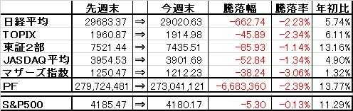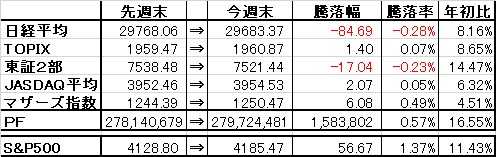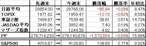 取引・なしPF(保有銘柄22銘柄)【現物】・2221 岩塚製菓×3,000株 (@3,762→3,456) 時価4,345±0 [PER11.6][PBR0.46]・3001 片倉工業×7,000株 (@1,268) 時価1,508△4 [PER11.9][PBR0.33*]・3431 宮地エンジニア×6,000株 (@1,669) 時価2,333▼10 [PER4.8][PBR0.56]・3504 丸八HD×32,400株 (@745→623) 時価807±0 [PER14.0][PBR0.27]・3537 昭栄薬品×10,000株 (@567→542) 時価1,002±0 [PER19.7][PBR0.44]・4365 松本油脂製薬×300株 (@9,706) 時価11,000ケ [PER17.8][PBR0.63]・4914 高砂香料工業×3,500株 (@2,568) 時価2,699▼1 [PER10.6][PBR0.43*]・6396 宇野澤組鐵工所×5,000株 (@2,310) 時価2,734ケ [PER19.5][PBR0.24*]・7279 ハイレックス×3,000株 (@1,081) 時価1,752▼8 [PER15.9][PBR0.41]・7453 良品計画×2,500株 (@1,146) 時価2,418▼21 [PER18.3][PBR3.14]・7485 岡谷鋼機×1,800株 (@9,254→8,356) 時価9,640△210 [PER6.9][PBR0.40]・7846 パイロット×1,500株 (@2,969) 時価3,485▼5 [PER13.1][PBR1.58]・7864 フジシール×4,500株 (@1,960) 時価2,537△35 [PER17.6][PBR1.39]・7931 未来工業×1,300株 (@1,702) 時価1,848▼15 [PER12.7][PBR0.72]・8219 青山商事×30,000株 (@495) 時価845▼15 [PER-][PBR0.23]・8293 ATグループ×10,000株 (@1,489) 時価1,560△1 [PER7.4][PBR0.24]・8802 三菱地所×20,000株 (@1,696→1,629) 時価1,906.0△1.5 [PER19.6][PBR0.42*]・9020 東日本旅客鉄道×400株 (@6,891→5,531) 時価7,570△5 [PER-][PBR0.66*]・9022 東海旅客鉄道×1,000株 (@16,726→12,651) 時価15,925△105 [PER-][PBR0.84]・9385 ショーエイコーポ×5,000株 (@1,001) 時価1,109△3 [PER8.3][PBR1.84*]・9734 精養軒×10,000株 (@901→787) 時価869▼10 [PER-][PBR0.34*]・9984 ソフトバンクG×1,000株 (-) 時価10,080.0▼70.0 [PER5.5][PBR0.79*] ※ほか株主優待株31銘柄、外国株(米国株、中国株)2銘柄保有【年間予想受取配当額】(税引前) 4,300,000-4,348,000円 (配当利回り1.59-1.61%)【年間受取確定配当額】(税引前) 3,018,300円株式 270,209,700円(96.6%)CP 9,514,781円(3.4%)合計 279,724,481円【年初来最高値】289,863,281円(3/22)【年初来最低値】236,553,300円(1/5)前日比 ▼61,500円週次 △1,583,802円月次 ▼620,152円年次 △39,724,481円+配当3,018,300円(年初より△16.55%※配当含まず)☆今日のコメント☆「小反落」【保有銘柄動向】 日経平均株価は小幅続伸。保有銘柄は岡谷鋼機、フジシール、JR東海が堅調。反面、ソフトバンクグループ、青山商事、良品計画は軟調となった。PFは小反落に。【今日の売買】 なし【今日の一言】 PFは小動き。フジシール、岡谷鋼機が最近堅調な値動き。☆今週のコメント☆「4週ぶりに反発」 今週は+1,583,802円(+0.57%)と4週ぶりに反発。指数は-0.28~+0.49%と今週も指数は小動きだった。今週はアオイ電子をすべて売却。ハイレックス、青山商事を一部売却へ。保有銘柄は岡谷鋼機、フジシール、昭栄薬品が堅調だった。 来週も引き続き3万円を上限にもみ合いを想定。CPも少しずつ回復して来たので新規銘柄の購入も進めて行きたい。※PBRの後ろに*表記がある銘柄は、賃貸用不動産等の含み益を加味した税引前の実質PBRの数値です。※取得単価に→があるものは、節税クロス前の単価→節税クロス後の単価となります。※当ブログに掲載されているコメントは、あくまで個人的見解に基づくものであり、特定銘柄への投資を推奨するものではありません。また当ブログに書かれている事は100%正確であるとは限りません。くれぐれも投資は自己責任でお願い致します。
