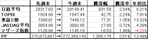取引・なし株式 271,890,500円(99.8%)CP 478,643円(0.2%)合計 272,369,143円【年初来最高値】289,863,281円(3/22)【年初来最低値】236,553,300円(1/5)前日比 △2,515,556円週次 △1,395,176円月次 ▼1,921,903円年次 △32,369,143円+配当3,270,800円(年初より△13.49%※配当含まず)☆今日のコメント☆「4日ぶりに大幅反発」【今日の売買】 なし【今日の一言】 日経平均は大幅反発。フェローテックが新中期経営計画を発表。24年3月期に売上高1500億、営業利益250億、純利益150億円と野心的な目標値を公表へ。☆今週のコメント☆「続伸」 今週は+1,395,176円(+0.51%)と続伸となった。指数は+0.72~+2.94%と日経平均、TOPIXの上昇が大きかった。今週の売買はなし。フェローテック、片倉工業、JR東海、JR東日本、ハイレックスが堅調だった。 来週はCPも殆どないことから銘柄入れ替え+銘柄の絞り込みに焦点を当たて少しでも改善出来るようにして行きたい。※PBRがピンクになってるものは、賃貸用不動産等の含み益を加味した税引前の実質PBRの数値です。※当ブログに掲載されているコメントは、あくまで個人的見解に基づくものであり、特定銘柄への投資を推奨するものではありません。また当ブログに書かれている事は100%正確であるとは限りません。くれぐれも投資は自己責任でお願い致します。