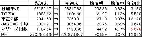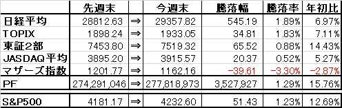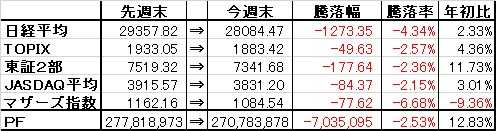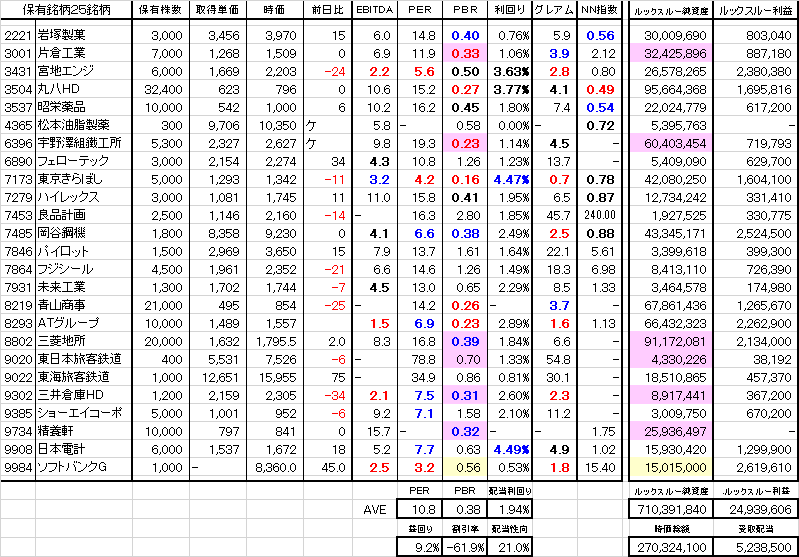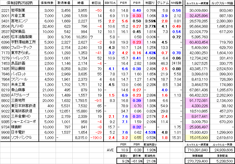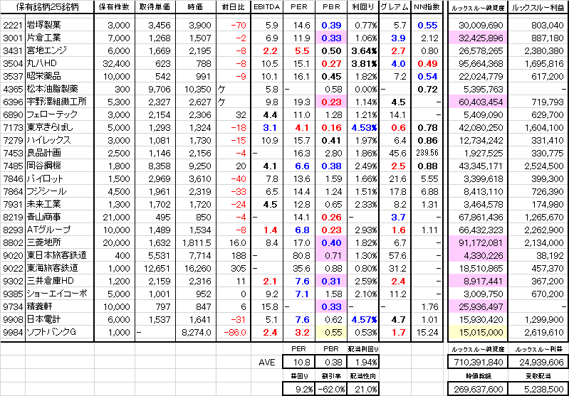 取引・なしPF(保有銘柄24銘柄)【現物】・2221 岩塚製菓×3,000株 (@3,762→3,456) 時価4,200▼30 [PER15.7][PBR0.42]・3001 片倉工業×7,000株 (@1,268) 時価1,449△40 [PER11.4][PBR0.31*]・3431 宮地エンジニア×6,000株 (@1,669) 時価2,235△3 [PER5.6][PBR0.50]・3504 丸八HD×32,400株 (@745→623) 時価795▼9 [PER15.2][PBR0.27]・3537 昭栄薬品×10,000株 (@567→542) 時価999▼3 [PER16.2][PBR0.45]・4365 松本油脂製薬×300株 (@9,706) 時価10,390ケ [PER-][PBR0.58]・6396 宇野澤組鐵工所×5,300株 (@2,327) 時価2,670△33 [PER19.7][PBR0.23*]・7173 東京きらぼしFG×5,000株 (@1,293) 時価1,374▼3 [PER4.3][PBR0.16]・7279 ハイレックス×3,000株 (@1,081) 時価1,689△28 [PER15.3][PBR0.40]・7453 良品計画×2,500株 (@1,146) 時価2,196△2 [PER16.6][PBR2.85]・7485 岡谷鋼機×1,800株 (@9,254→8,358) 時価9,270▼150 [PER6.6][PBR0.38]・7846 パイロット×1,500株 (@2,969) 時価3,560△105 [PER13.4][PBR1.57]・7864 フジシール×4,500株 (@1,961) 時価2,469△98 [PER15.3][PBR1.32]・7931 未来工業×1,300株 (@1,702) 時価1,749△9 [PER13.0][PBR0.66]・8219 青山商事×22,500株 (@495) 時価852△44 [PER14.1][PBR0.26]・8293 ATグループ×10,000株 (@1,489) 時価1,555△49 [PER6.9][PBR0.23]・8802 三菱地所×20,000株 (@1,696→1,632) 時価1,791.5△12.5 [PER16.8][PBR0.39*]・9020 東日本旅客鉄道×400株 (@6,891→5,531) 時価7,453△241 [PER78.1][PBR0.69*]・9022 東海旅客鉄道×1,000株 (@16,726→12,651) 時価15,845△460 [PER34.6][PBR0.86]・9302 三井倉庫HD×1,200株 (@2,159) 時価2,394△51 [PER7.8][PBR0.32*]・9385 ショーエイコーポ×5,000株 (@1,001) 時価957△11 [PER7.1][PBR1.59]・9734 精養軒×10,000株 (@901→787) 時価830- [PER-][PBR0.32*]・9908 日本電計×6,000株 (@1,537) 時価1,566△34 [PER7.2][PBR0.59]・9984 ソフトバンクG×1,000株 (-) 時価8,528.0△61.0 [PER3.3][PBR0.57*] ※ほか株主優待株32銘柄、外国株(米国株、中国株)2銘柄保有【年間予想受取配当額】(税引前) 5,154,500-5,202,500円 (配当利回り1.94-1.96%)【年間受取確定配当額】(税引前) 3,270,800円+252,500円株式 265,237,700円(98.0%)CP 5,546,178円(2.0%)合計 270,783,878円【年初来最高値】289,863,281円(3/22)【年初来最低値】236,553,300円(1/5)前日比 △2,916,600円週次 ▼7,035,095円月次 ▼3,507,168円年次 △30,783,878円+配当3,270,800円(年初より△12.83%※配当含まず)☆今日のコメント☆「4日ぶりに大幅反発」【保有銘柄動向】 日経平均株価は4日ぶりに大幅反発。保有銘柄もソフトバンクグループ、JR東日本、JR東海、三菱地所、良品計画などの大型株や、パイロット、フジシール、日本電顕、三井倉庫、片倉工業など堅調な銘柄が多かった。反面、岡谷鋼機、丸八HD、岩塚製菓などは軟調も、PFは4日ぶりに大幅反発。【今日の売買】 なし【今日の一言】 PFは4日ぶりに大幅反発。持ち株で宮地エンジ、松本油脂製薬、青山商事が決算発表。青山商事が来期配当は未定も黒字転換予想。保有株の決算出揃いルックスルー純利益が2440万円と過去最高額に拡大へ。☆今週のコメント☆「大幅反落」 今週は-7,035,095円(-2.53%)と大幅反落となった。指数も-2.15~-6.68%と軟調で先週に続きマザーズ指数の軟調が目立った。今週は青山商事(一部)を売却。日本電計、東京きらぼしを新規買いへ。保有銘柄は軟調な銘柄が多かったが、三井倉庫、フジシール、パイロット、青山商事はしっかりだった。 来週は決算発表もほぼ出そろったことから、PFの再構築を進めて行きたい。※PBRの後ろに*表記がある銘柄は、賃貸用不動産等の含み益を加味した税引前の実質PBRの数値です。※取得単価に→があるものは、節税クロス前の単価→節税クロス後の単価となります。※当ブログに掲載されているコメントは、あくまで個人的見解に基づくものであり、特定銘柄への投資を推奨するものではありません。また当ブログに書かれている事は100%正確であるとは限りません。くれぐれも投資は自己責任でお願い致します。
