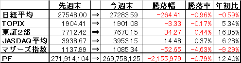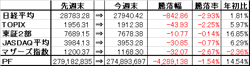 【週間騰落率】【ポートフォリオ】取引・なし株式 269,653,432円(99.9%)CP 104,693円(0.1%)合計 269,758,125円【年初来最高値】289,863,281円(3/22)【年初来最低値】236,553,300円(1/5)前日比 ▼2,669,376円週次 ▼2,155,979円月次 ▼8,318,527円年次 △29,758,125円+配当3,275,800円(年初より△12.40%※配当含まず)☆今日のコメント☆「大幅反落」【今日の売買】 なし【今日の一言】 日経平均、PFともに大幅反落。7月は-831万円(-2.99%)とマイナスに。JR東日本、JR東海が1Q決算発表。いずれも最終赤字も赤字幅は縮小。東海は通期業績の下方修正。再び新型コロナの感染が広がっており、業績回復には要時間か。☆今週のコメント☆「続落」 今週は-2,155,979円(-0.79%)と続落となった。指数は-4.63~+0.37%と指数により差が目立った。日経平均が年初来マイナスに転落へ。今週はショーエイコーポを見切り売り、キヤノンを一部品受けへ。 来週から1Q決算が徐々に本格化へ。業績内容で株価が大きく動く可能性もあるため、決算内容をしっかり吟味して行きたい。※PBRがピンクになってるものは、賃貸用不動産等の含み益を加味した税引前の実質PBRの数値です。※当ブログに掲載されているコメントは、あくまで個人的見解に基づくものであり、特定銘柄への投資を推奨するものではありません。また当ブログに書かれている事は100%正確であるとは限りません。くれぐれも投資は自己責任でお願い致します。