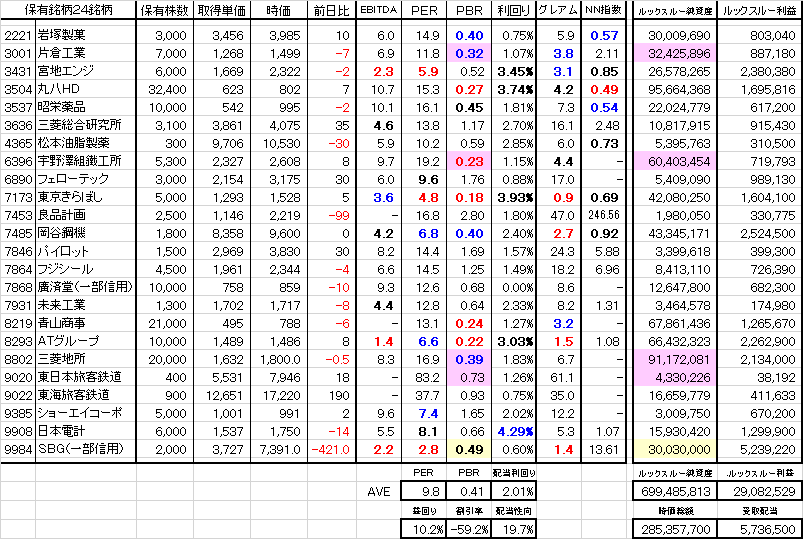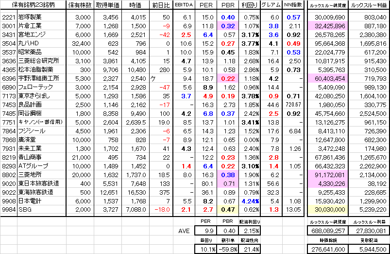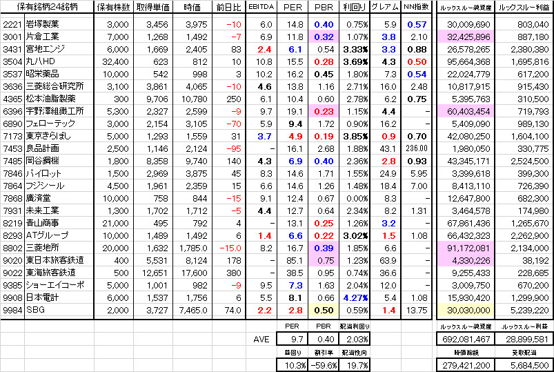 取引・なし株式 277,197,300円(99.9%)CP 345,497円(0.1%)合計 277,542,797円【年初来最高値】289,863,281円(3/22)【年初来最低値】236,553,300円(1/5)前日比 ▼2,223,900円週次 ▼1,640,038円月次 ▼533,855円年次 △37,542,797円+配当3,320,800円(年初より△15.64%※配当含まず)☆今日のコメント☆「大幅反落」【今日の売買】 なし【今日の一言】 PFは久し振りに全面安の展開。昨日レバレッジを解消したのは正解だった。フェローテック、ソフトバンクグループの軟調続く。※PBRがピンクになってるものは、賃貸用不動産等の含み益を加味した税引前の実質PBRの数値です。※当ブログに掲載されているコメントは、あくまで個人的見解に基づくものであり、特定銘柄への投資を推奨するものではありません。また当ブログに書かれている事は100%正確であるとは限りません。くれぐれも投資は自己責任でお願い致します。