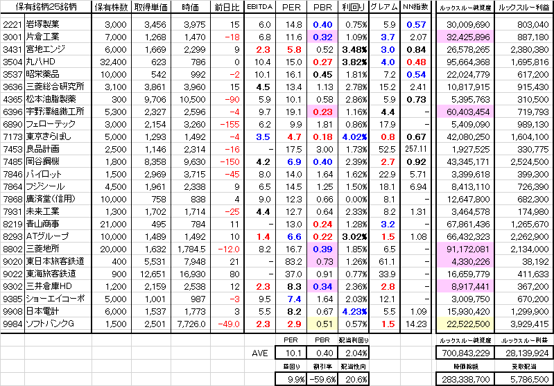 取引・なし株式 278,772,300円(99.9%)CP 345,497円(0.1%)合計 279,117,797円【年初来最高値】289,863,281円(3/22)【年初来最低値】236,553,300円(1/5)前日比 ▼536,600円週次 △4,224,100円月次 △1,041,145円年次 △39,117,797円+配当3,275,800円(年初より△16.30%※配当含まず)☆今日のコメント☆「4日ぶりに反落」【今日の売買】 なし【今日の一言】 PF、日経平均ともに今日は反落。感染者数拡大でJRなどアフターコロナ銘柄の軟調が目立つ。※PBRがピンクになってるものは、賃貸用不動産等の含み益を加味した税引前の実質PBRの数値です。※当ブログに掲載されているコメントは、あくまで個人的見解に基づくものであり、特定銘柄への投資を推奨するものではありません。また当ブログに書かれている事は100%正確であるとは限りません。くれぐれも投資は自己責任でお願い致します。