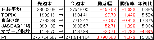 【週間騰落率】【ポートフォリオ】取引・なし株式 274,548,200円(99.9%)CP 345,497円(0.1%)合計 274,893,697円【年初来最高値】289,863,281円(3/22)【年初来最低値】236,553,300円(1/5)前日比 △600,800円週次 ▼4,289,138円月次 ▼3,182,955円年次 △34,893,697円+配当3,320,800円(年初より△14.54%※配当含まず)☆今日のコメント☆「3日ぶりに反発」【今日の売買】 なし【今日の一言】 朝方は大幅安も結果的にはプラス転換へ。フェローテック、宮地エンジ、三菱総研が堅調だった。☆今週のコメント☆「3週ぶりに大幅反落」 今週は-4,289,138円(-1.54%)と3週ぶりに大幅反落となった。指数は-0.14~-2.93%といずれの指数も下落と軟調だった。今週はJR東海を一部売却。ソフトバンクグループ、廣済堂を品受しレバレッジ解消へ。保有銘柄はJR東海、東日本、宮地エンジ、岡谷鋼機、丸八HDが比較的堅調だった。 来週から1Q決算が徐々に本格化して行くことから業績の動向に注視しつつ、より良い銘柄に乗り換えて行きたい。※PBRがピンクになってるものは、賃貸用不動産等の含み益を加味した税引前の実質PBRの数値です。※当ブログに掲載されているコメントは、あくまで個人的見解に基づくものであり、特定銘柄への投資を推奨するものではありません。また当ブログに書かれている事は100%正確であるとは限りません。くれぐれも投資は自己責任でお願い致します。