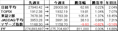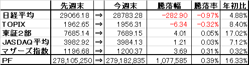 取引・なし株式 271,683,828円(99.9%)CP 104,470円(0.1%)合計 271,788,298円【年初来最高値】289,863,281円(3/22)【年初来最低値】236,553,300円(1/5)前日比 △639,203円週次 △513,397円月次 ▼5,649,151円年次 △32,427,501円+配当3,275,800円(年初より△13.51%※配当含まず)☆今日のコメント☆「反発」【今日の売買】 なし【今日の一言】 日経平均、PFともに反発。SBG、フェローテック、良品計画が大きく上昇へ。※PBRがピンクになってるものは、賃貸用不動産等の含み益を加味した税引前の実質PBRの数値です。※当ブログに掲載されているコメントは、あくまで個人的見解に基づくものであり、特定銘柄への投資を推奨するものではありません。また当ブログに書かれている事は100%正確であるとは限りません。くれぐれも投資は自己責任でお願い致します。