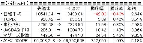 ・今週は+722,695円と先週に続き上昇となったが、ジャスダック、マザーズの上昇率には及ばなかった。特にマザーズは年初からすでに+9%強の上昇となっており、PFの+5%先行されている。売買は夢の街、上村工業を売却。伊勢湾海運を買いと、より低PBR、高配当利回り銘柄にシフトした。