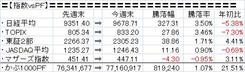 ・今週は+819,240円と2週連続で上昇となったものの、日経平均、TOPIXなどの上昇率と比べるとPFの上昇率は低かった。USS、オービックなど主力株が堅調で、新晃工業、ケーユーなども堅調だった。