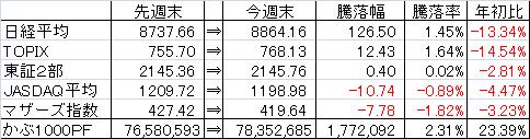 ・今週は+1,772,092円と先週の下落分以上を回復する大幅反発となった。日東電工、ジャフコ、富士フィルムなどこれまで軟調だった主力大型株が上昇した事が大きかった。四季報効果+8月の月次好調だったコメ兵もPFを牽引した。
