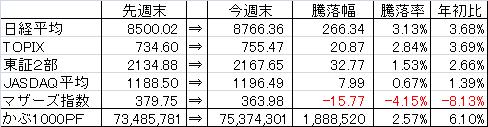 ・今週は+1,891,520円と7週連続上昇と堅調だった。極東証券、卑弥呼、KG情報が大幅高となりPFを牽引。下落続いたジャフコ、JCOMなどの大型株も下げ止まったのも貢献した。来週は高値警戒感がある中、今後も上昇が続くのか見極めて行きたい。