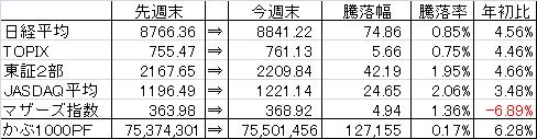 ・今週は+127,155円と8週連続上昇も上昇幅は小幅で、上昇率もいずれの指数を下回った。山田コンサル、北川工業、名村造船などは堅調だったものの、ジャフコが軟調で、瀧上工業、コメ兵、イマジニア、新川などこれまで上昇を続けてきた銘柄が軟調となり、PFの足を引っ張った。