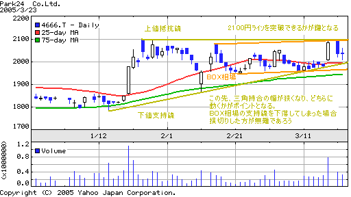 さらにさらにキャッシュポジションをあげる為に、そして持ち株を整理する為に損切&微小利益確定に走ってたら、約定した後、さらに騰がる騰がる▼▼ヽ($ = =)トオイメまぁ、いつもの事というか、昨日損切ってたら大損。まだ良かったかなと(前向きに前向きに)ウェブクルー、321000円約定、今日の終値325000円。イーアクセス、90900円約定、今日の終値93700円。特にイーアクセスは損切った後、後場からストップ高でした(爆)(ノ∇▼$)ノ彡☆ ギャハハ!!バンバンッ!!我ながらすごすぎる(汗)まぁ、多少なりとも利益があるからいいものの見てられませんでしたョ。▼▼ヽ($ = =)トオイメで、キャッシュポジションもしっかりあげましたし、銘柄を絞りに絞って選ぼうと思います。だいたい、ちょっと銘柄選び適当すぎたんだよな。それにチャートの形も悪いものばかり選んでたようです…底値は平行、高値は下落しつつの三角持合は下落の可能性が大きい三角持合。こればっかり選んでました(汗)でも、ウェブクルーはちょっと突き破った感じだったけど…まーまー。違う銘柄を選ぼうって事で。で、目をつけたのが「パーク24」チャートはこちら。どうです?三角持合もちゃんと底値を切り上げつつ、上値もはっきりわかってるチャート。結構良くない?良くない?どうなのよ?(自信はあまりない)双喜が見つけた時は2025円程度だったのですが、落ち着いて、ここは2005円で指値でとりあえず200株、打診買い。2100円が当面の目標。三角持合、ボックス相場にも見えますので損切ラインはボックス相場のやや下の値段でと計画を立て購入。下がったら買い増ししようと思っています。危ないかなぁ(謎)上昇相場でも買い場が何度かあるのできっちりラインが引ける上がり相場のチャートを探してこれから購入していきたいです。いい情報お待ちしてます(謎)▼▼ヽ∵ゞ(>ε< $)ぶっ!たぶんそうはうまくいかないだろーけど、楽しみです♪←ランキング参加中♪せめて双喜チャートはストップ安はいやだ!!とめてください(謎)良ければクリックよろしくお願いしますペコリ( ̄- ̄$)(_ _$)ぁそういえば、朝一番にニッポン放送の株価をチェックしていました。あまり値動きないんでおかしいなぁと、他を見ていて、後場ちらりと覗くとストップ高。ZAIに買収される側の会社を買い、買収する側の会社は売りと書いていましたが、その通りの展開。ちゃんと信じればよかったな(笑)もったいないことしました(って買う気はさらさらなかったですけど)しかし、株式投資をしだして早半年。250万円近くを投資して、カブドットコム証券を抜きにすれば、5万円の利益しか出せてません。▼▼ヽ∵ゞ(>ε< $)ぶっ!まぁ、銀行金利よりいいのが慰めですが、景気いい話を聞いてると日記に一日一日の感想を入れる為にブログを書いてるものの恥ずかしくなる投資ですね($ノωノ)-------------------------------------------------------------------------【双喜の保有銘柄の動き】☆ダイキン工業100株【目標(?)】02/22【2645】2645円で100株購入。チャートは十字線、一年チャートにて底値確認購入。02/23【2615】下ヒゲ形成。これから上昇?ヵ?02/24【2610】2.3日もみあって上昇すると期待しています。どうだろうなぁ~♪02/25【2625】やや上昇。そのままいってちょー02/28【2610】ぁ、ぁれ?下落?!むむぅ…。今日から上昇の予定が(汗)03/01【2690】一時は2700円超え。一日遅れの上昇でした♪このまま順調に上がりますよーに(願03/02【2675】昨日上げすぎたせいか調整?でもやっぱりもう一度下落もあるかもしれませんが悲観するほどでもないと見てます。03/03【2770】+95です。急上昇♪上昇気流にこのまま乗れるかな?03/04【2720】荒い動きです(笑)しかし上昇気流は逃してないと思われる。03/07【2735】このまま上昇ヵ?03/08【2710】何が上昇だよー(涙03/09【2745】ややこしい動きです(笑)03/10【2685】ギョエ!!2600円台にまた戻っちゃったョ。03/11【2670】やっぱり上げてくれないのね(涙03/14【2665】このへんで調整してもらって再度上昇を…03/15【2640】ダブル底形成?2600円で落ちたナイフを拾います!03/16【2700】そのままおいてけぼり。拾えませんでした。03/17【2660】あれ?また下げた。どうやら調整のようです。下げたら拾いたいな03/18【2735】下降トレンド突破。長期でW底抜けて本格上昇してくれるかな?03/22【2625】どうやら2600~2700円のボックス相場になりそうな感じです03/23【2580】ここを底と思いたい。というかやっぱり下降トレンド真っ只中。早期利益確定撤退を今度は徹底します!(上昇するのヵ?03/24【2615】あまり上昇は期待できません。2700円台にぎりぎりってとこヵ?早期利益確定しなきゃ!☆イーアクセス2株【目標110000円】03/16【90000】購入後、いい感じで上昇していきましたが、後場下落。ま、こんなもんヵ。89700円で2株約定。03/17【93900】一気に上昇。やはり下げすぎていたのか?短期のリバウンドだと思ったが…03/18【93000】今日はさすがに下げると思ったけど思ったより下げてない。いいかもしれない?(謎)03/22【91100】ガッツリ下げてくれ