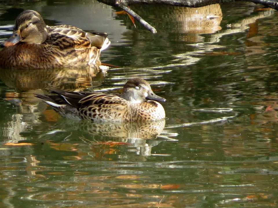 羽を休めていました。トモエガモ雄は生殖羽、雌は胸に幼羽よりもまだらな斑が
