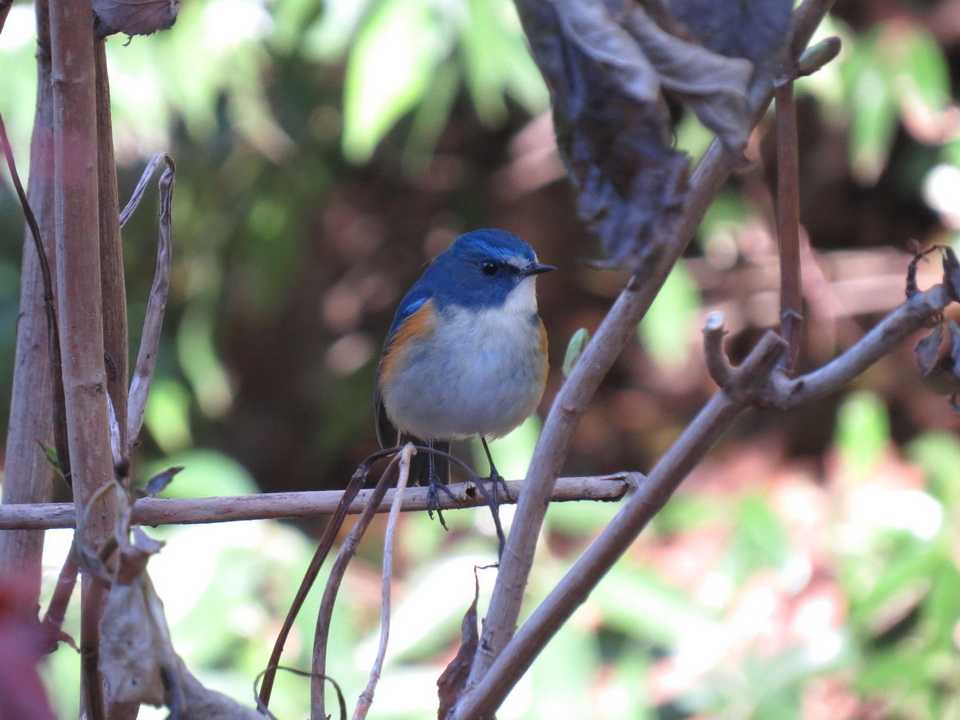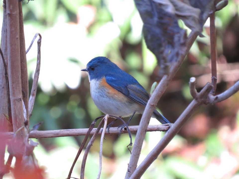 ルリビタキは成鳥雄で上面全体が青く、眉斑が白く、脇がオレンジ色が印象的。