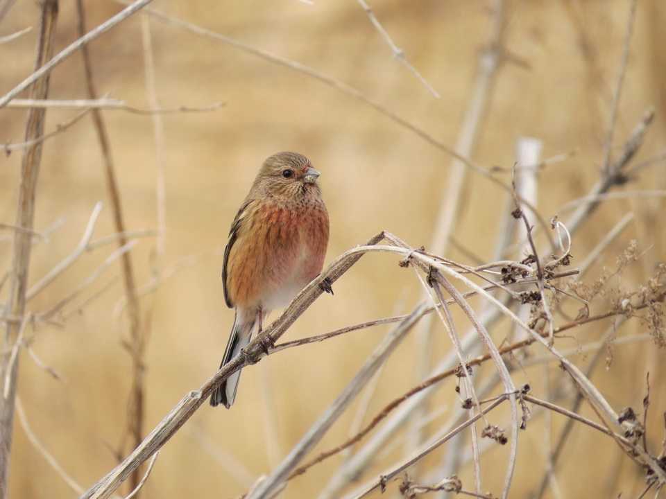 待機していると葦原と川沿いの草薮にベニマシコ雄と雌、若鳥と思われる3羽が