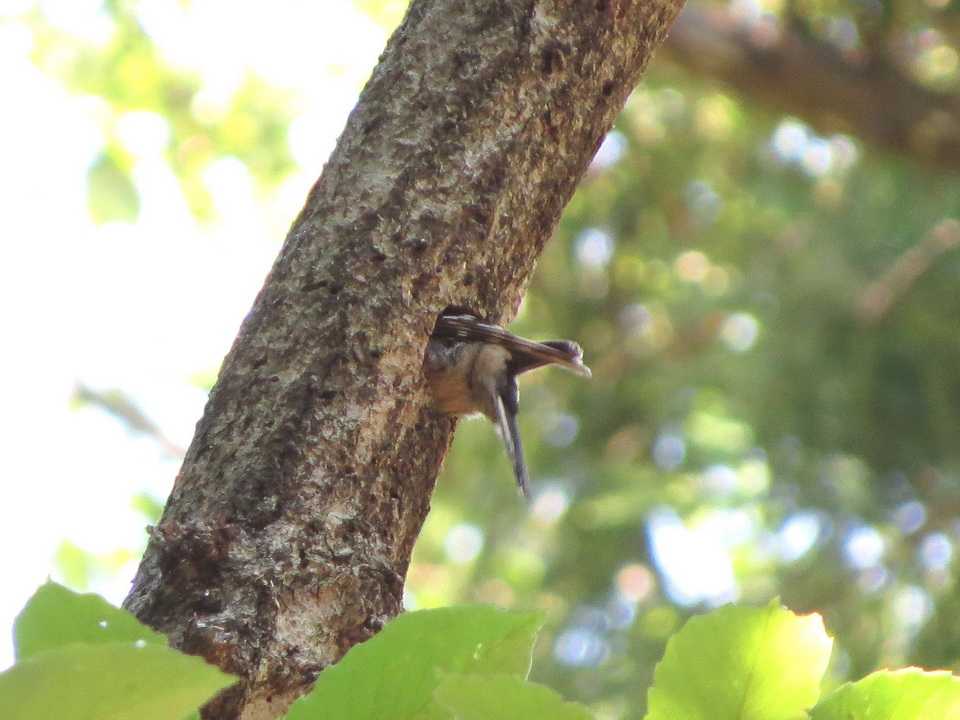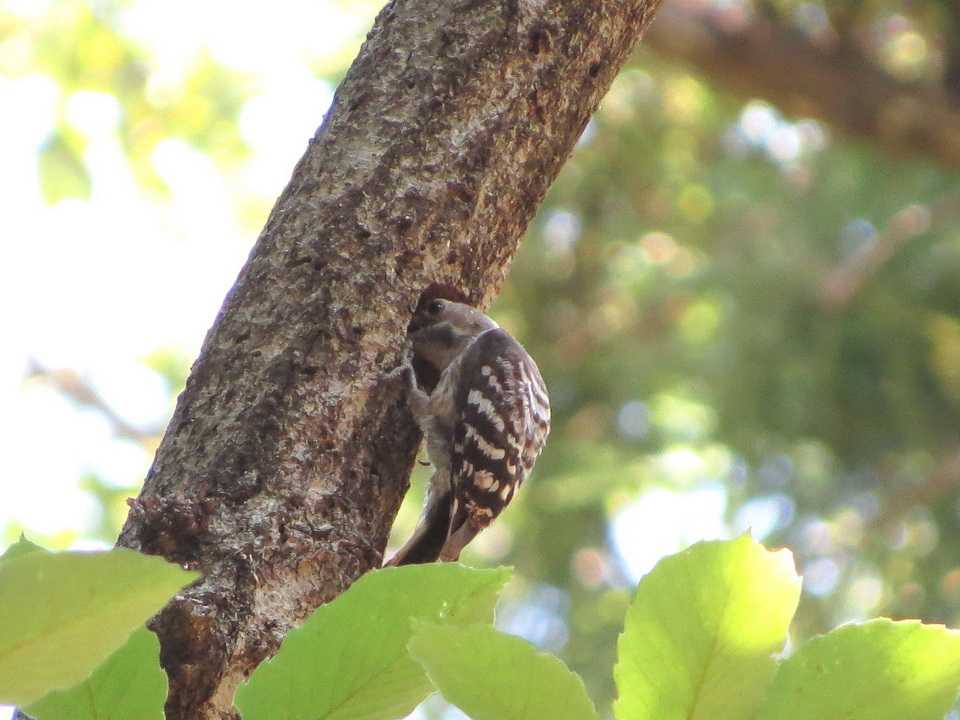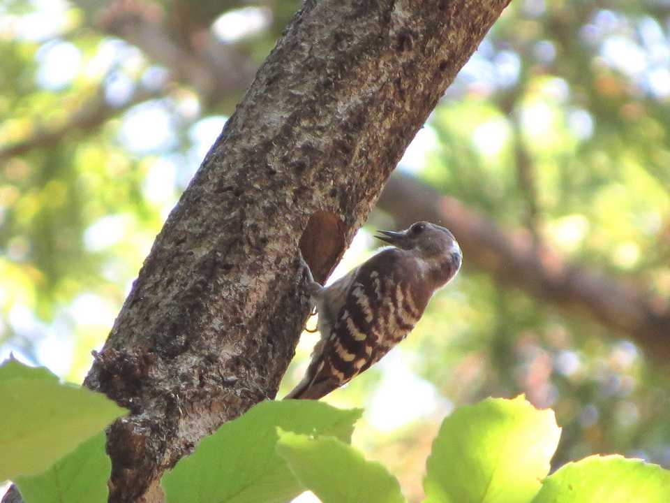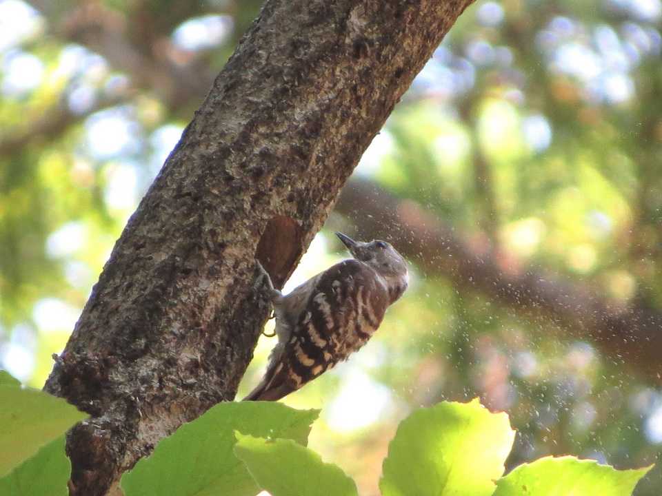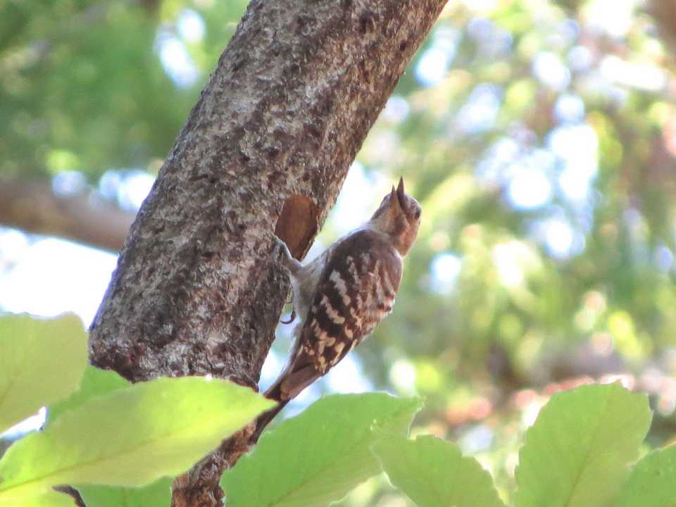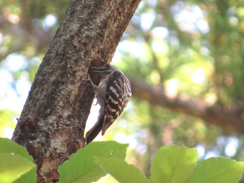 動き回っています。このうち、コゲラが木の幹を嘴でつつき、体がすっぽり入るサイズの穴