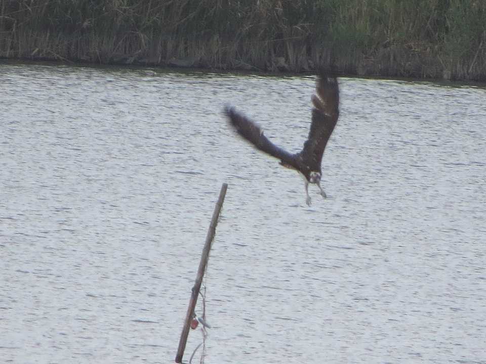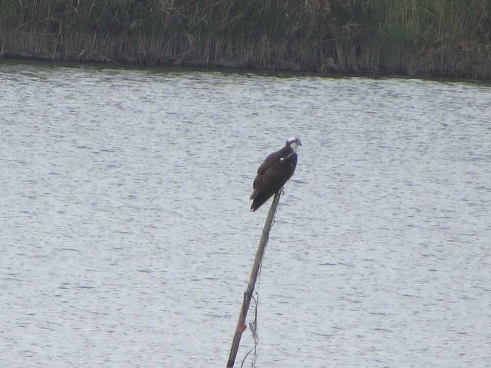 田んぼのノビタキを堪能した後は、沼の水面に目をやると杭にミサゴの姿を発見。