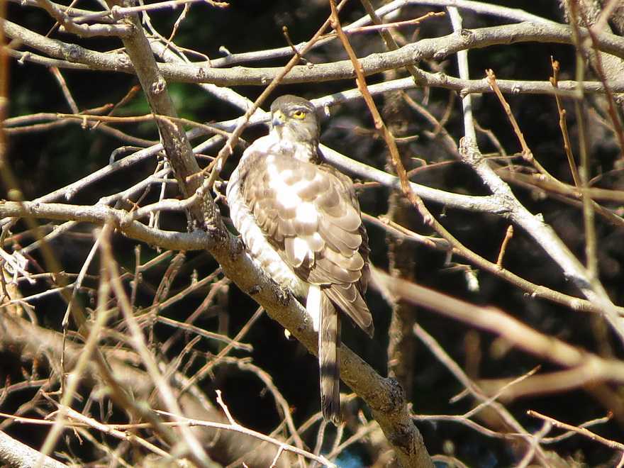 そろそろ帰路につこうと思ったら、今度は柿の木の枝にタカの鳥影。