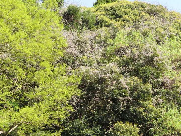 複数箇所でサシバりの姿を発見。1つ目の谷津田では道路沿いの電柱にその姿、2つ目の谷津田ではサシバの姿が3羽あり、1羽の雌をめぐり熾烈な争奪戦が展開されていました。ペア成立の2羽は上空で鳴き交わし、急上昇、急降下を何度も繰り返すディスプーフライトを披露。この谷津田では山の藤が咲き始めており、平年よりニ週間以上早い開花です。