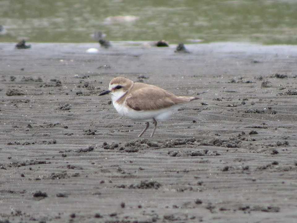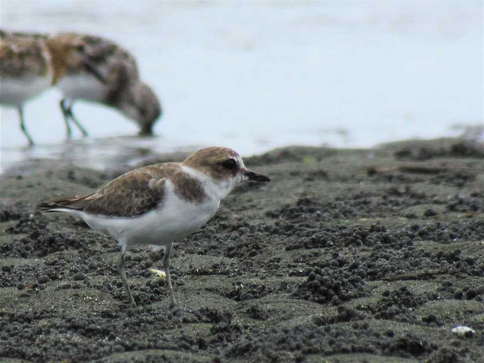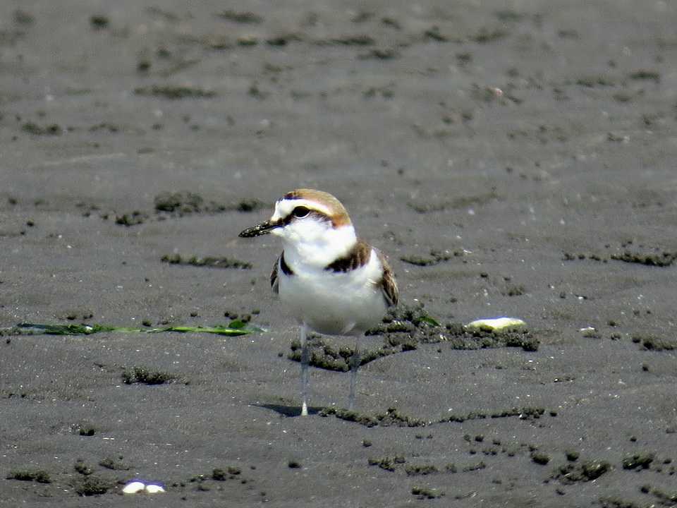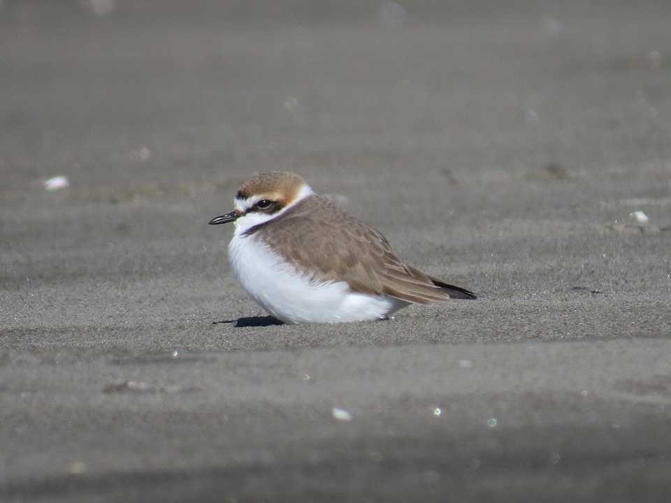 胸の帯が前面でつながらない点ではシロチドリと同様ですが、嘴がシロチドリよりも太いので相違します。背と頭の褐色が白帯で分かれるはずですが写真の個体ではそのように見えません。頭頂部に着目してみると、平たい印象があります。
