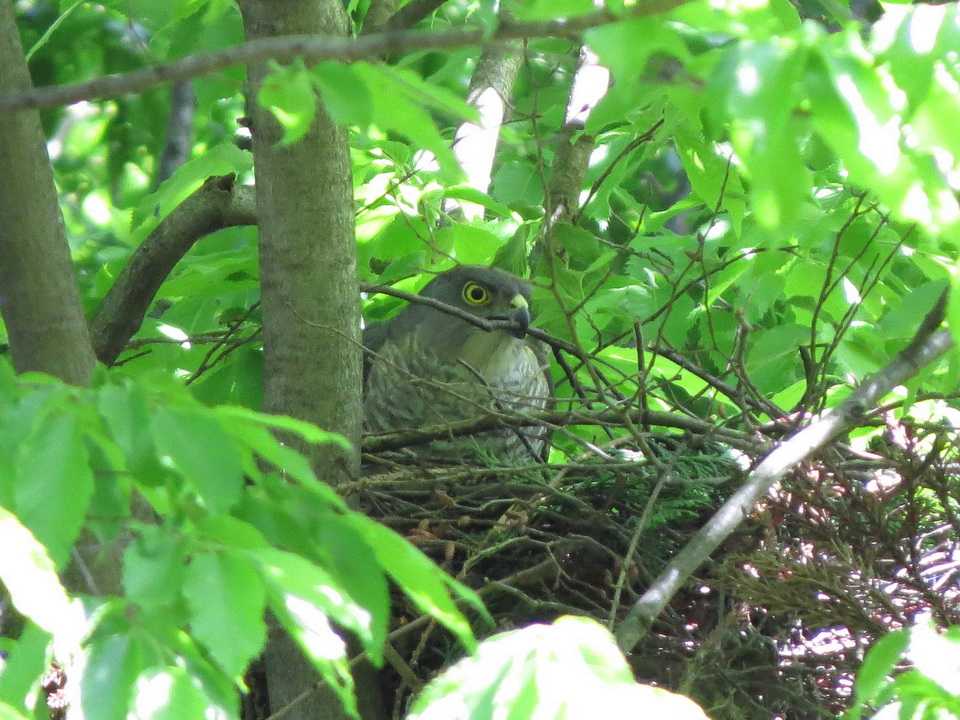 ツミが巣材にハンガーを利用しているのを目撃したことはありませんが、平野(2000)が栃木県宇都宮市の住宅地で1999年の繁殖期に巣材にハンガーを利用した1つがいのツミを観察した内容を報告していますから、目撃した巣がカラスのものか、ツミのものか注目しています。