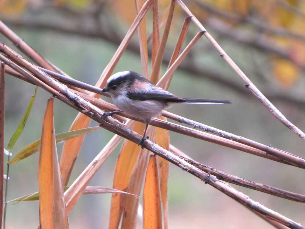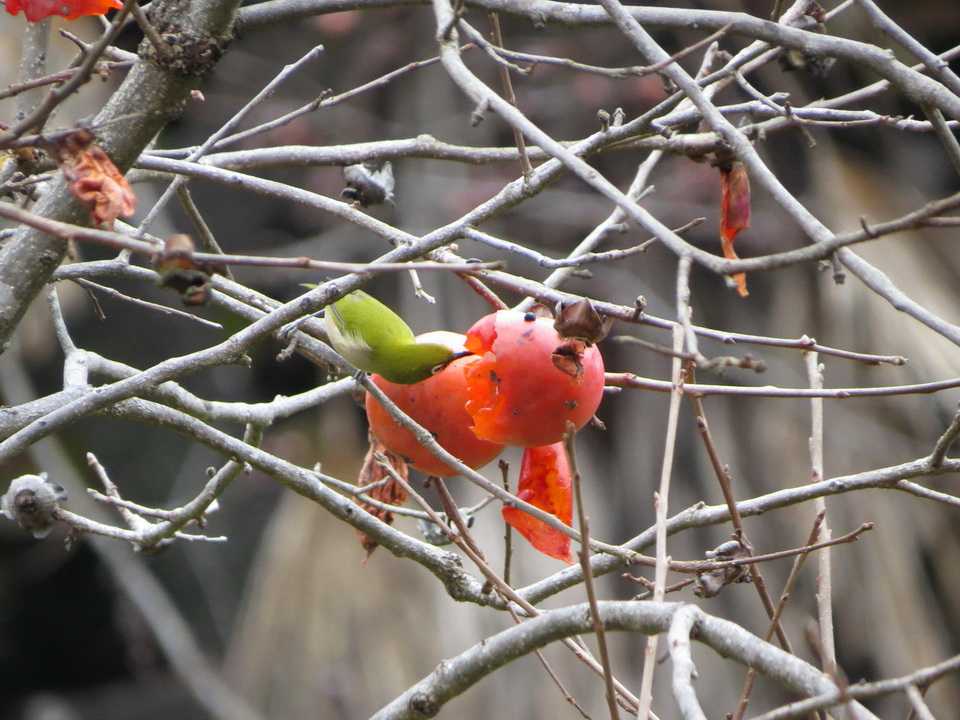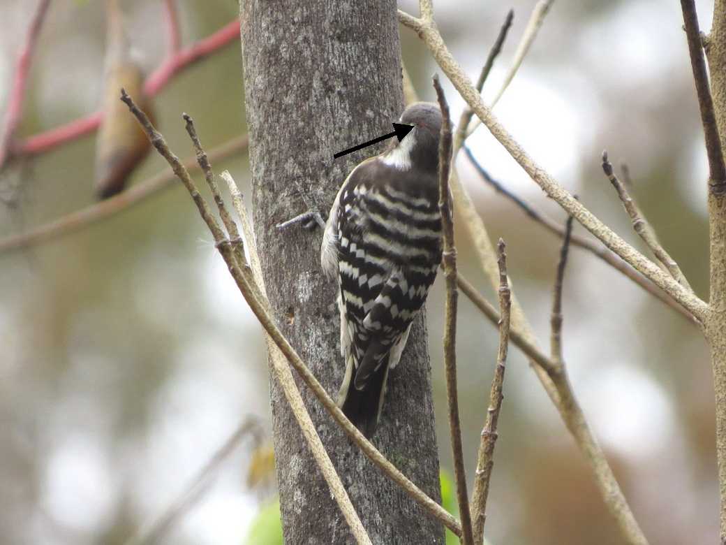 朝から曇り空で気温も上がらずでしたが、小鳥の動きは案外活発で小さな池の葦原にはエナガ、シジュウカラが葦の中に潜む虫を採食したり、メジロが熟した柿の実をついばみに何度も飛来する光景を目撃できました。そぐ近くにある細い木の幹にコゲラが飛来したので後頭部側面の赤い羽を期待して観察と記録撮影。帰宅してから後頭部を確認してみると、左右両方に赤い羽を発見。数枚でしかも7ミリ程度と言われていますから観察できてラッキーでした。
