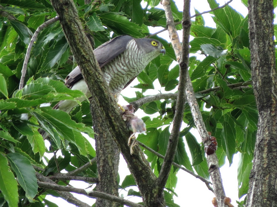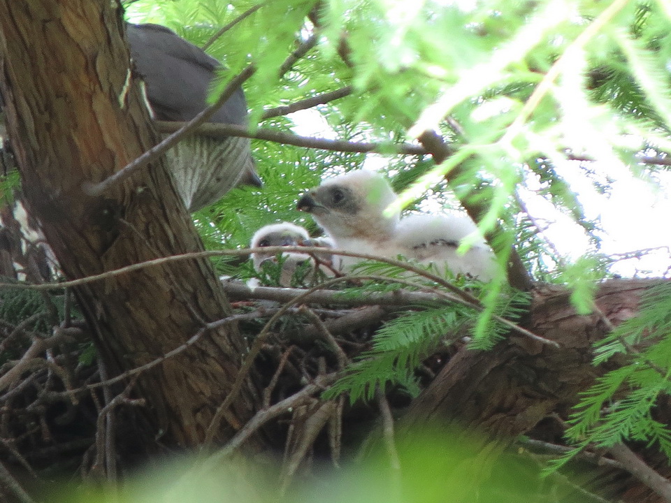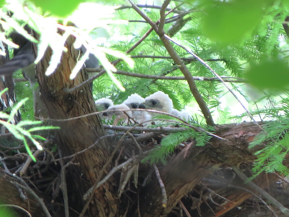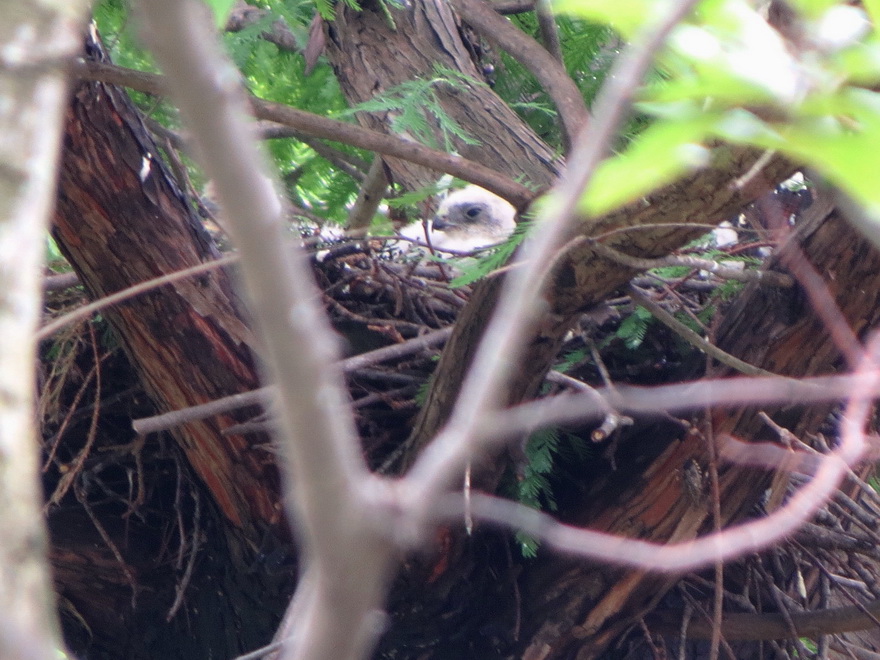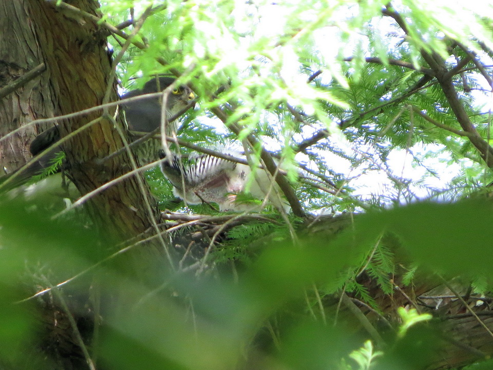 成長してくると、成鳥雌が餌を朝一番に運搬しちぎってヒナに与えた後、巣の滞在することはなくなりました。しかし、営巣木のそばの低木にオナガが飛来すると見張り台の枝を飛び立ち、鋭い鳴き声とともに襲いかかっていました。外敵の姿がなくなると、雌は見張り台に戻り警戒モードに。