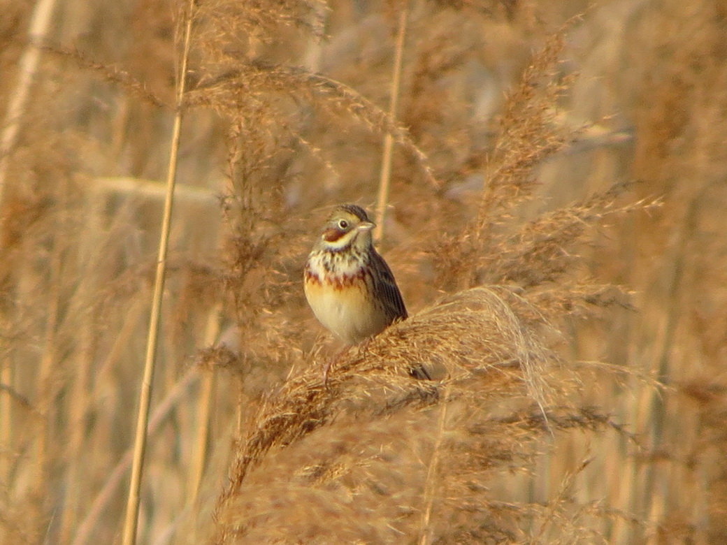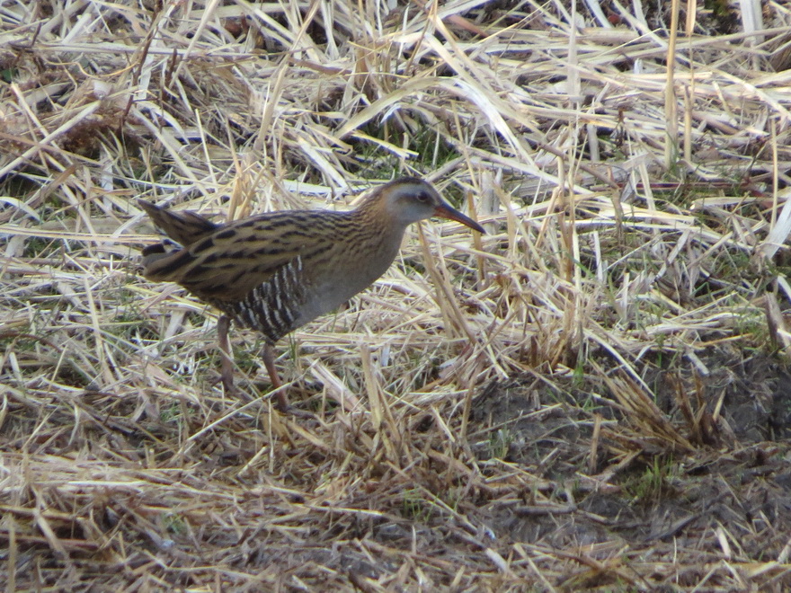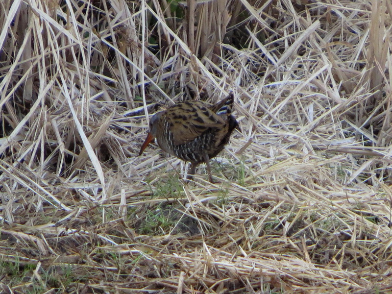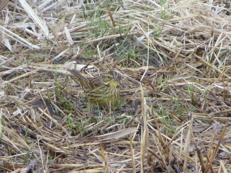 今日は合計4羽の姿を見つけ、近くにホオジロ、カシラダカ、アオジ、オオジュリンといったホオジロ類、その足元で昆虫類や種子を探して移動するクイナの姿を観察しました。