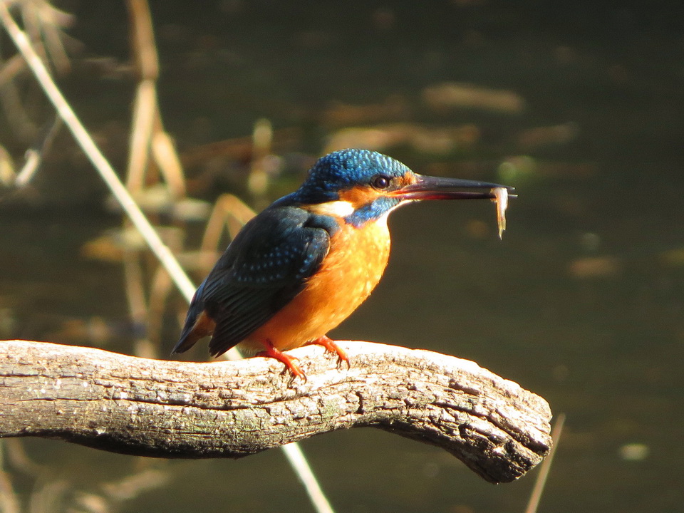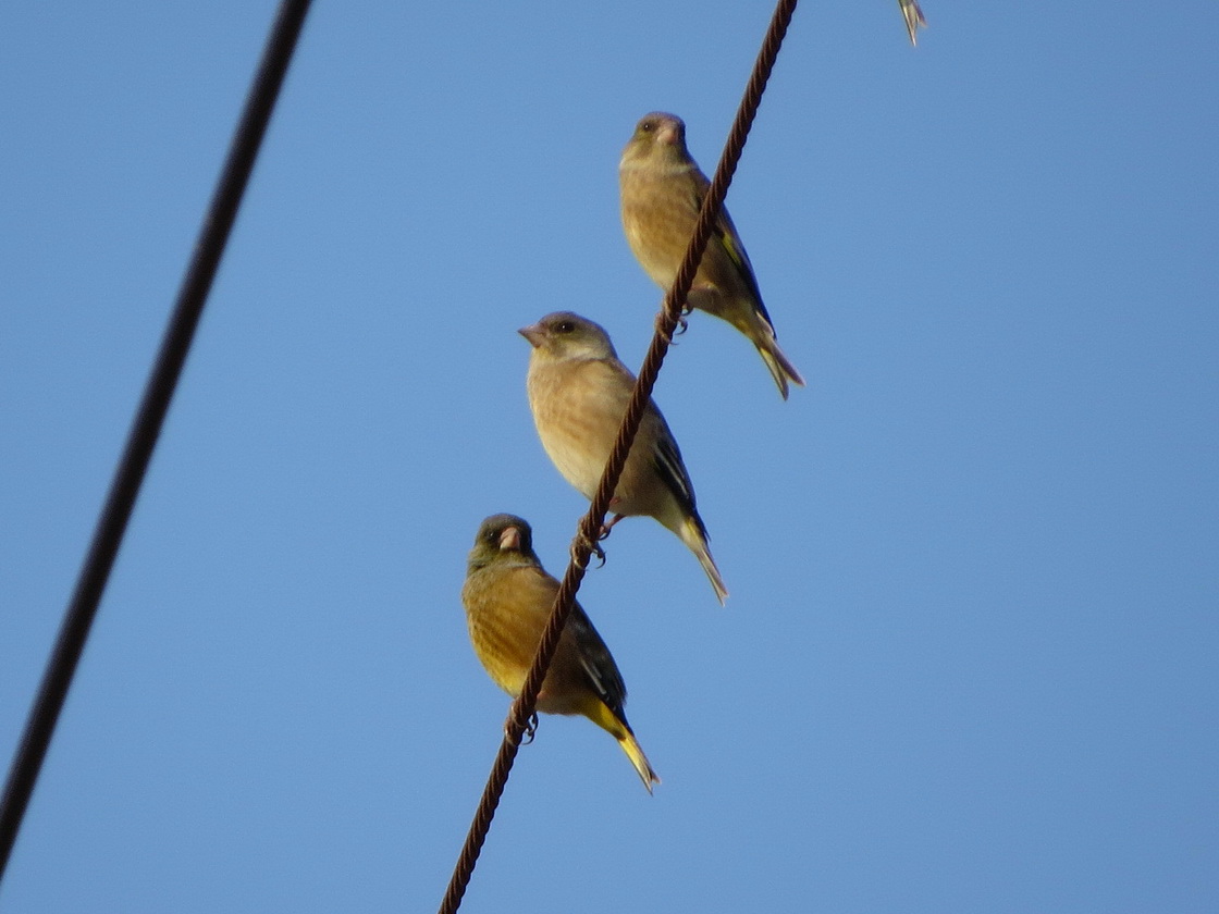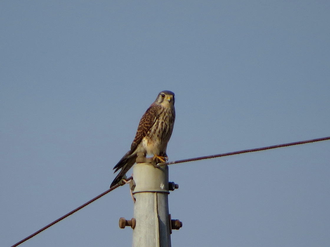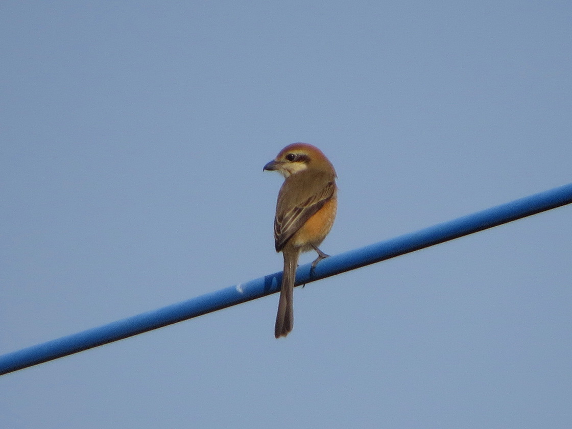 このほか、複数のモズ雌雄が電線にとまり牽制する姿、亜種オオカワラヒワの姿、水田の小動物を狙うチョウゲンボウが電柱に止まっている姿、帰り道、近くの公園内の池でカワセミが小魚を捕食する姿を観察し、現地を後にしました。
