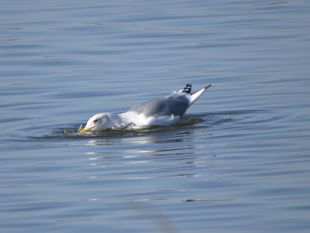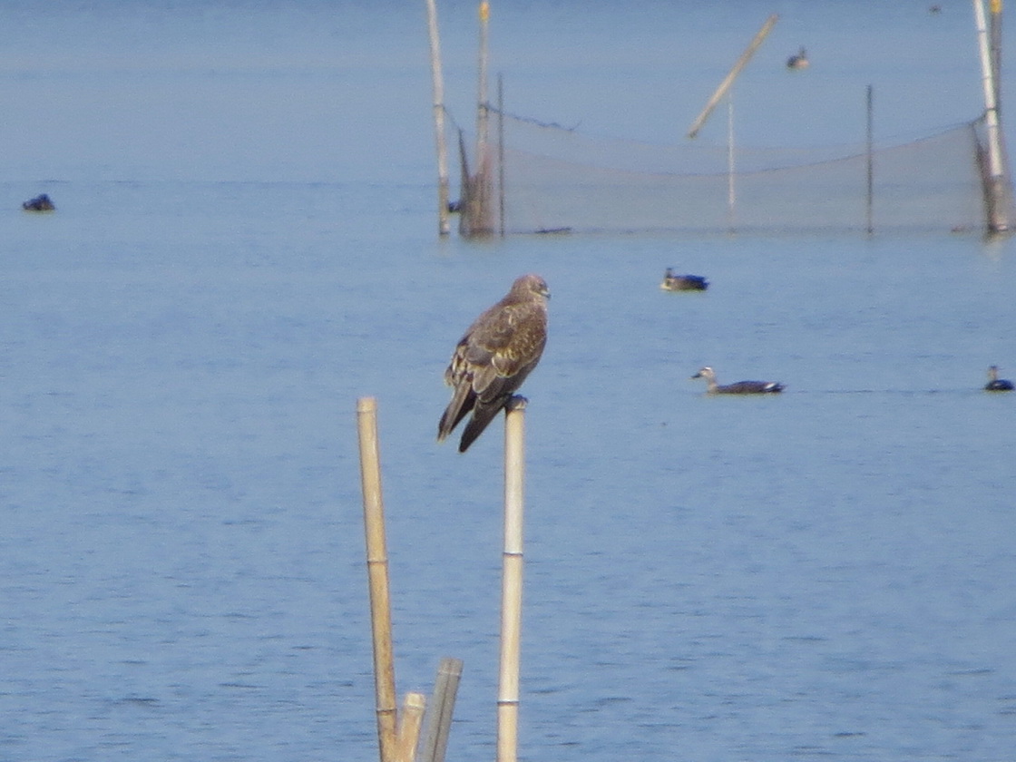 カモは、ヨシガモ、ヒドリガモ、マガモ、カルガモ、オナガガモ、トモエガモ、コガモ、ホシハジロといった種類、カンムリカイブリ、水面に浮かびながら魚を食べようと悪戦苦闘しているセグロカモメ、杭にチュウヒ(風切は青灰色はなし)の姿がありました。