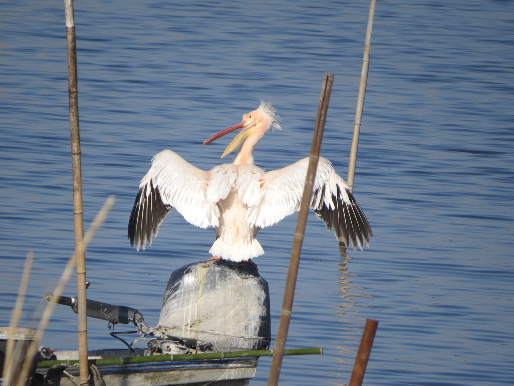 このほか、モモイロペリカンがいつもの船着き場で休んでいると思ったら、自力で水面を移動し魚を捕獲しに出かけ、その後休み場所に帰還する姿を目撃しました。
