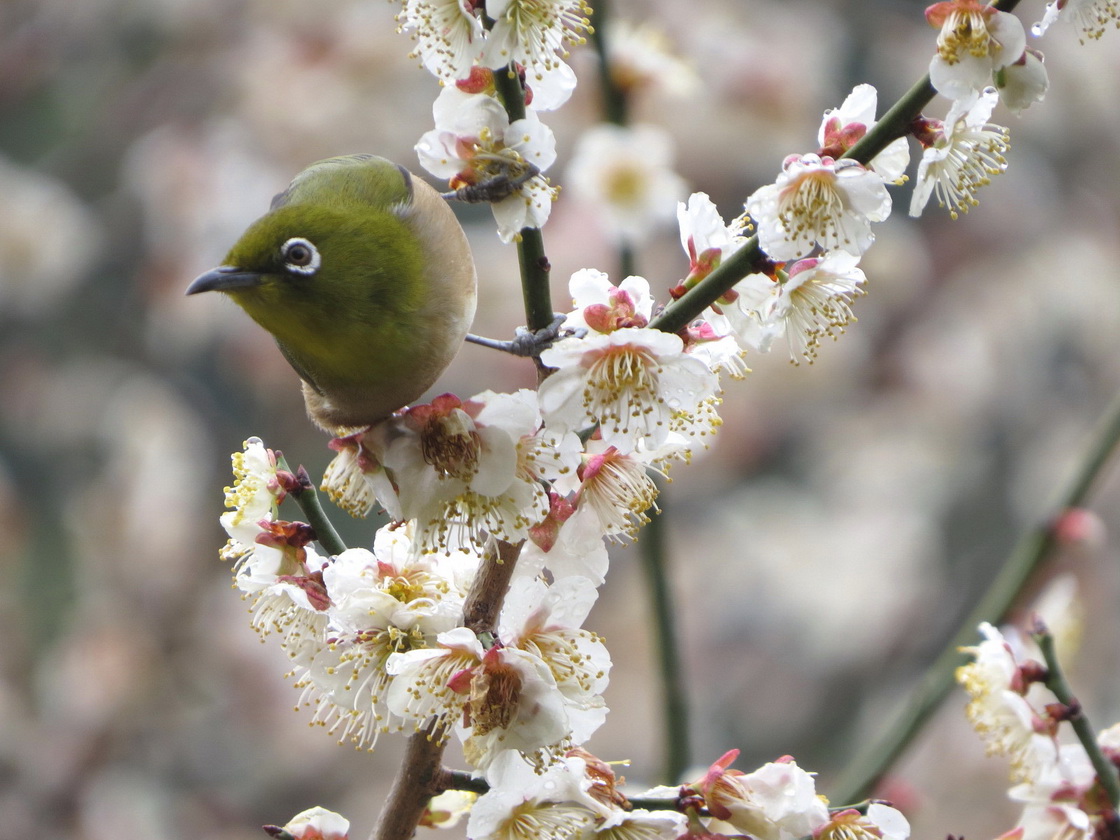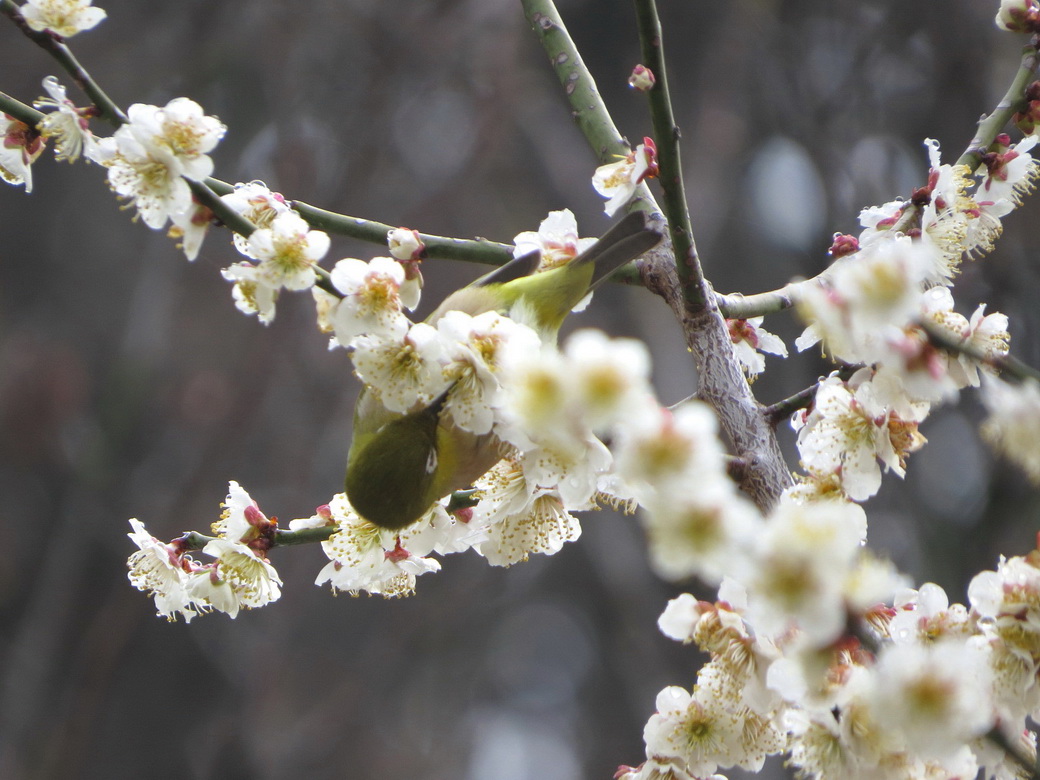 満開の梅の花蜜を吸いにくるメジロ、ヒヨドリの様子を観察するのが今日のテーマ。