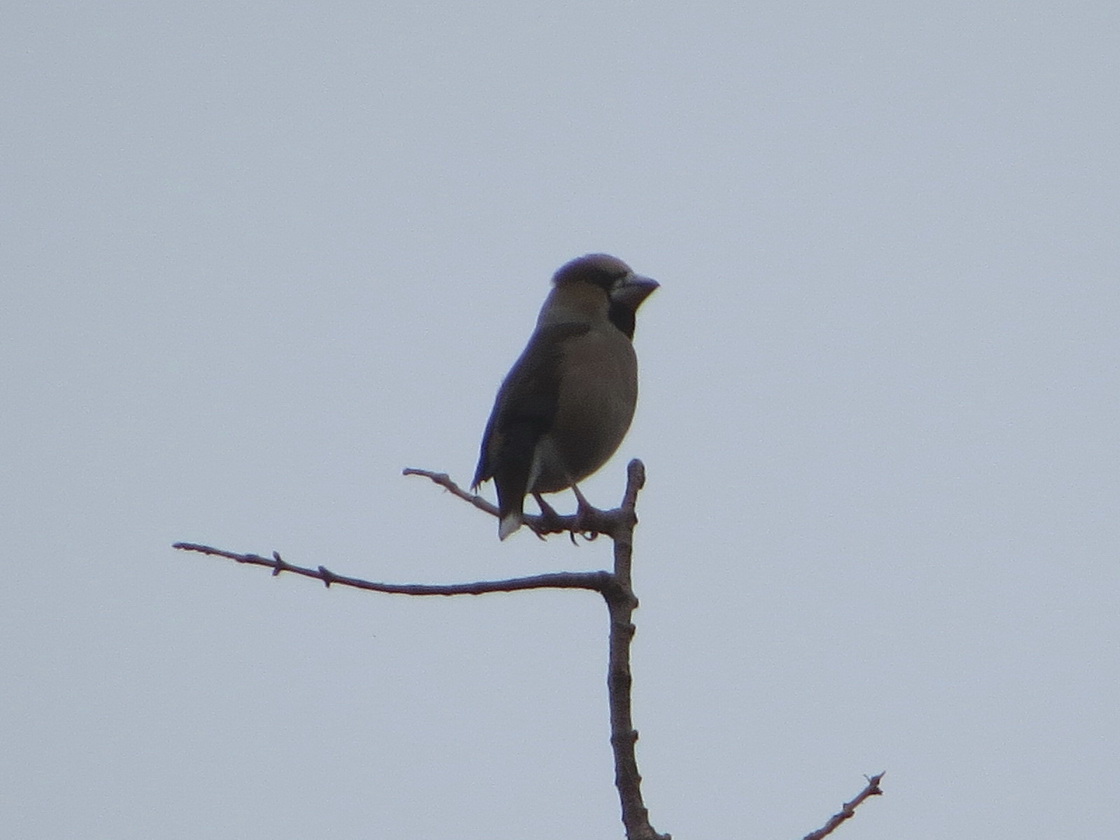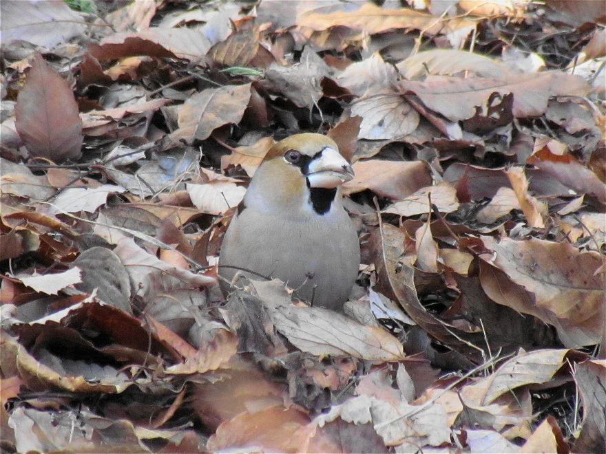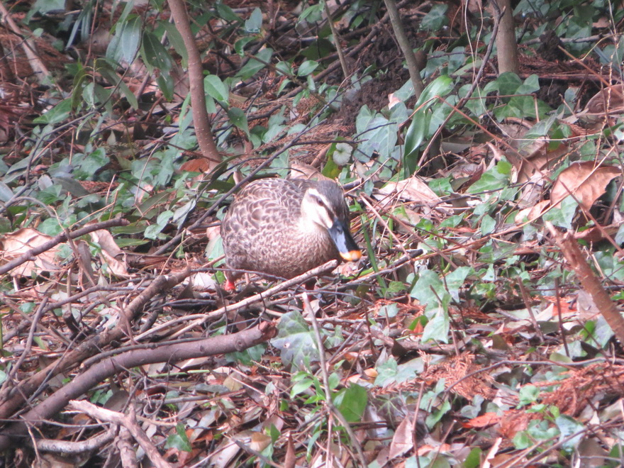 谷津田の小さな池で餌探しに余念のないカルガモ、草地で地中の音を聞いているように耳を傾けていたツグミ、最も高さの高い木のてっぺんにシメの姿を見つけました。