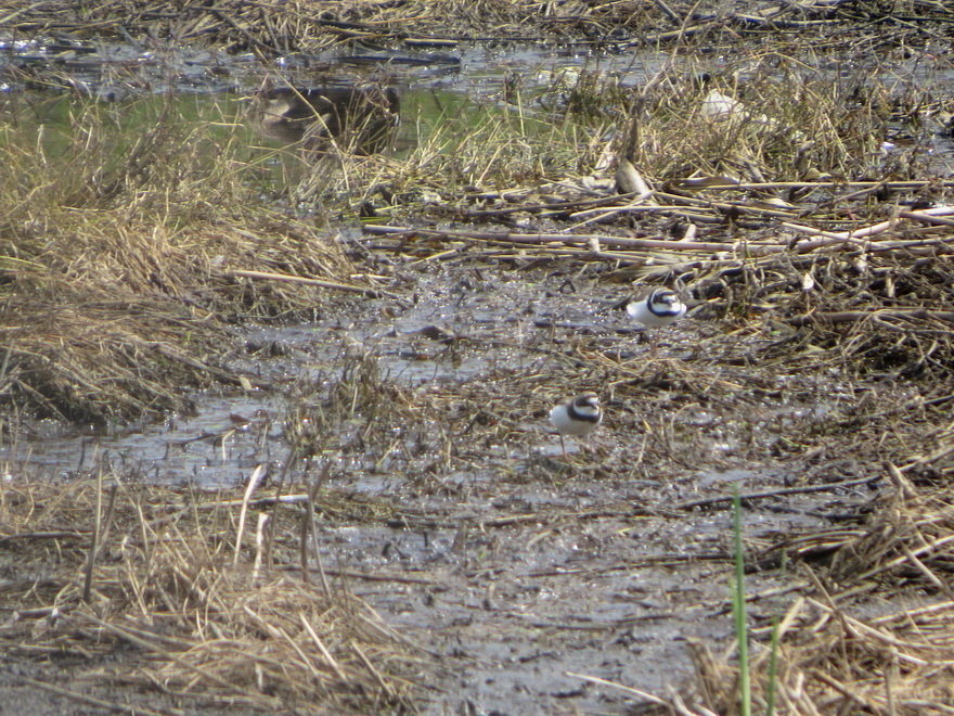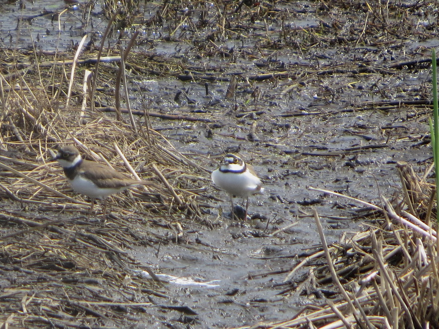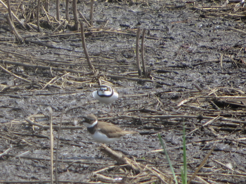 よく見るとコチドリの雌雄で、雄が羽毛を膨らませて雌を猛追。