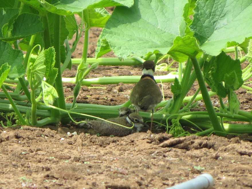 しかし、畑地には里芋の葉が日陰をつくっていて日中の気温が高い時間帯は成鳥と共にヒナたちは日陰にいて、幼鳥のみ地面に座り込んで休む姿が見られます。