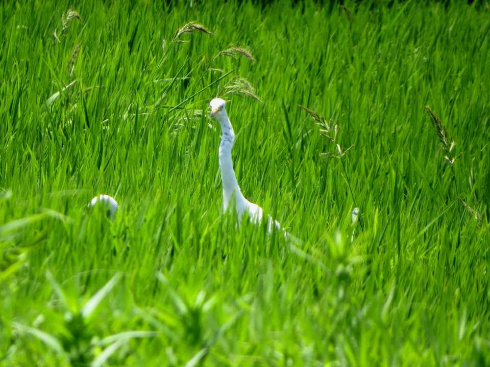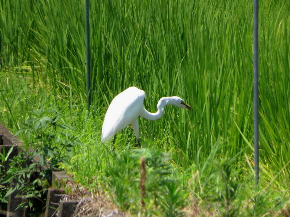 ダイサギの餌のとり方に注目していると、小高い場所から水路を覗き込んで待伏せして採食する方法、稲穂の隙間から田んぼの中を覗き込み水面のタニシの動きを観察してとらえる方法、背の高さと首の長さを生かして上から覗き込みカエルの動きを凝視している光景と実にいろいろな光景を目にできました。