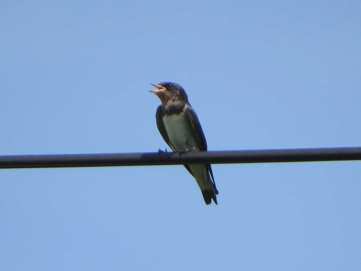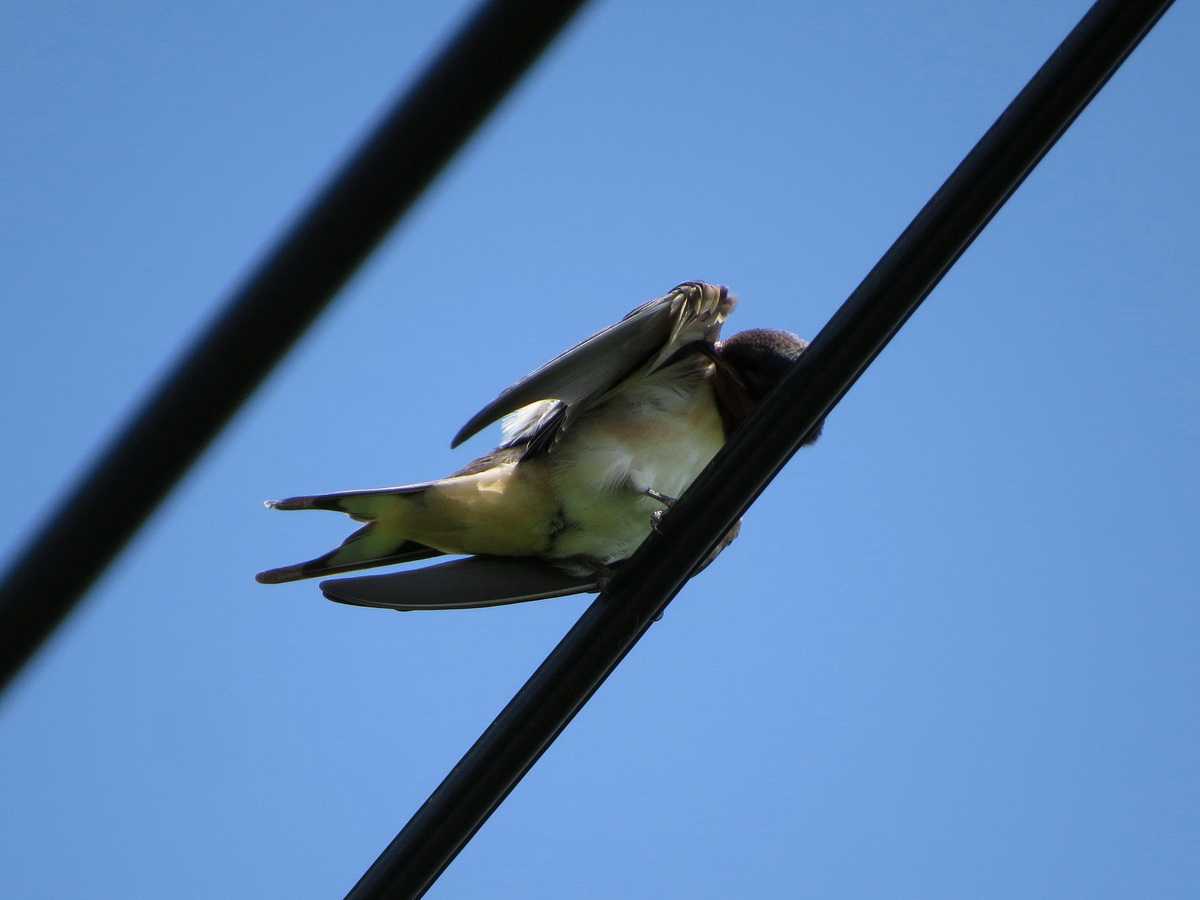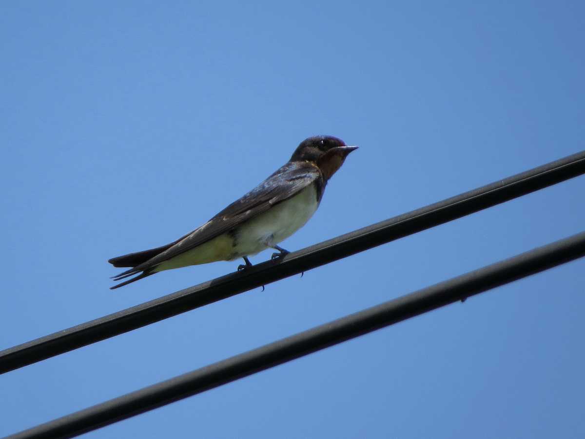 駅まで帰路、電線にツバメが電線に横並びに止まっており、大半は若鳥でしたが、一羽は下面の一部と下尾筒が赤茶色の亜種アカハラツバメとツバメの交雑個体でした。