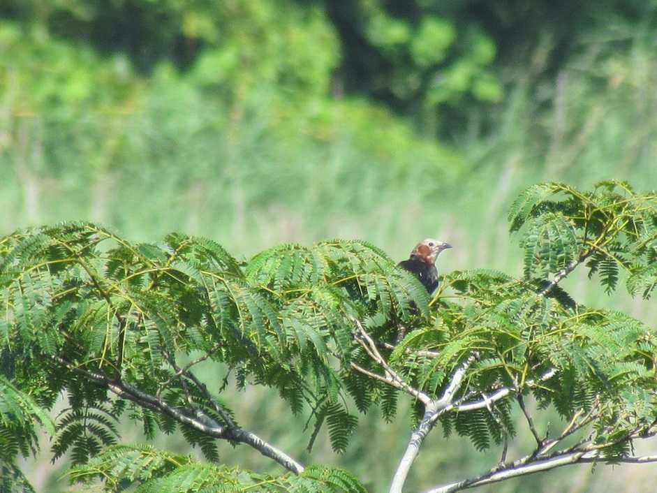 頭部は白く、耳羽、頬、側頸は赤茶色で、中雨覆に白斑があります。
