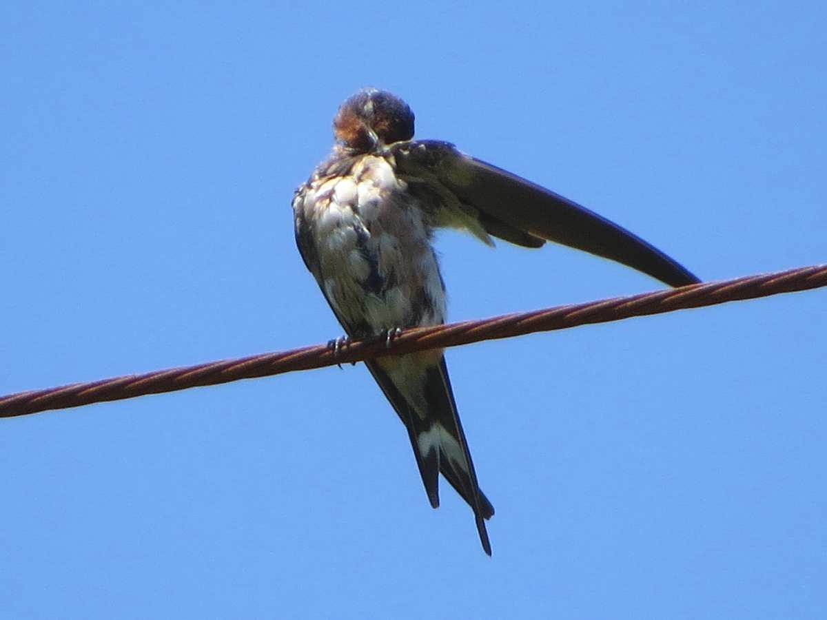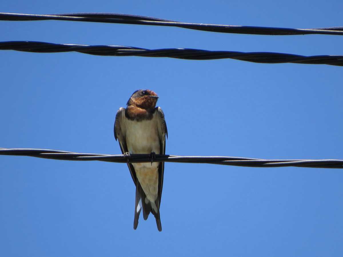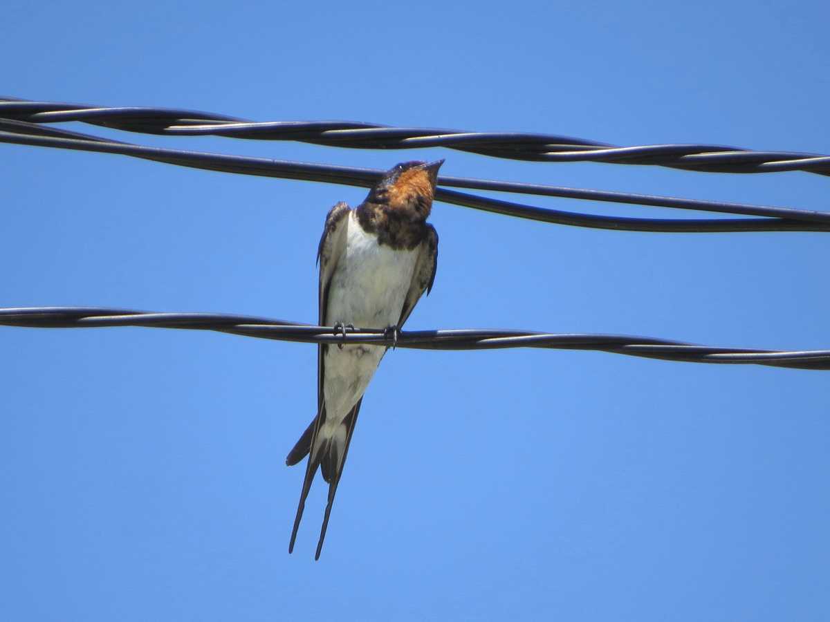 電線に55羽が並んで止まっていたうち、1羽が亜種アカハラツバメ(Hirundo rustica saturata)、2羽が亜種アカハラツバメ(Hirundo rustica saturata)と亜種ツバメ(Hirundo rusutica gutturalis)の交雑と思われる個体でした。