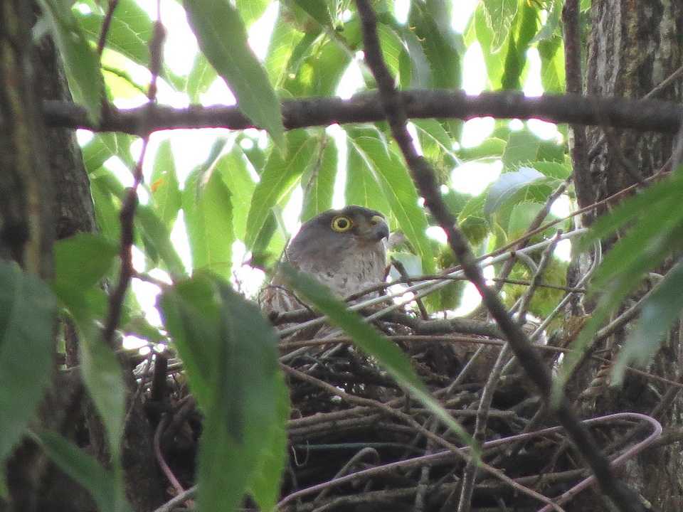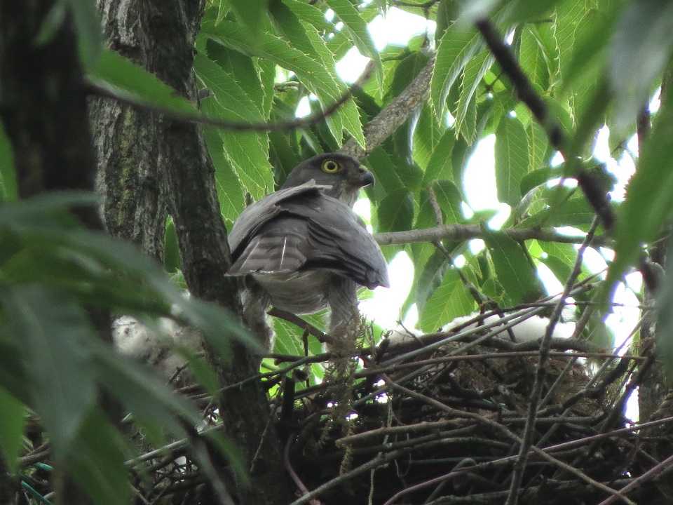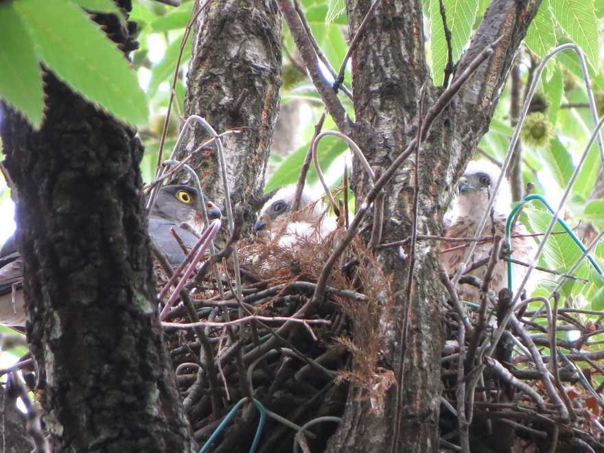 鳥友の町でカラスの古巣に産卵したツミのペアの雛の様子を見に出かけました。
