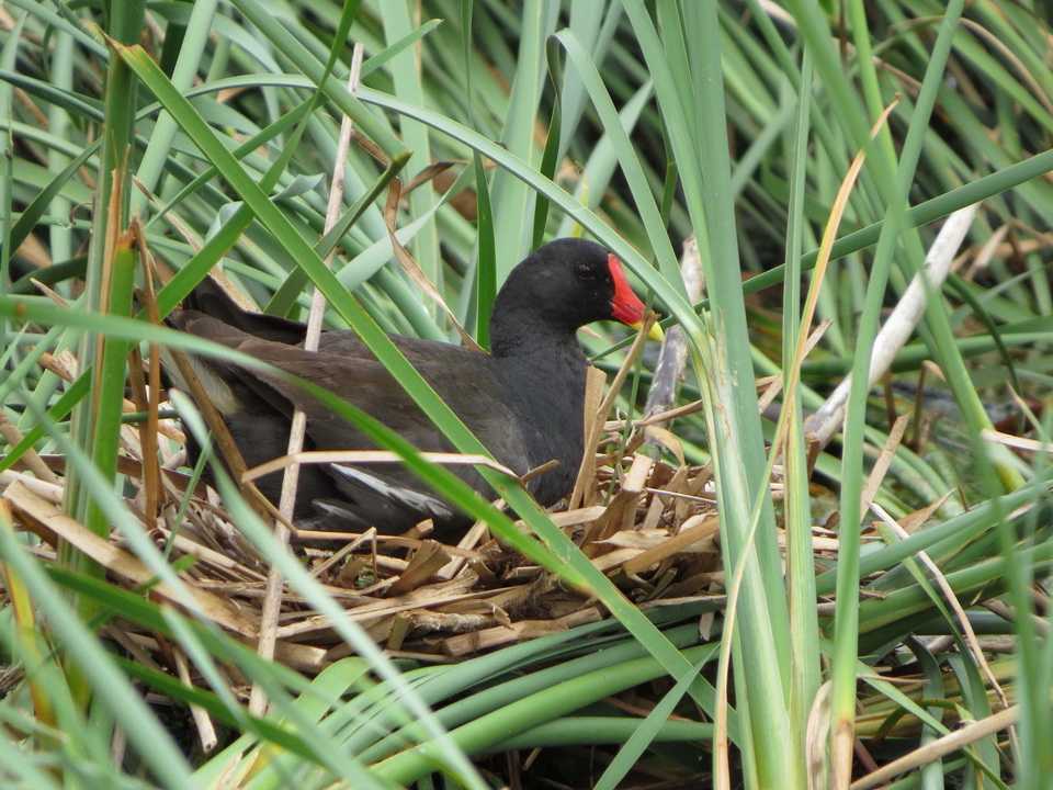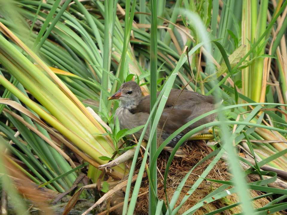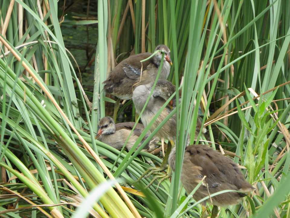 西口の調整池の一角では、二回目の造巣で誕生したバンの幼鳥7羽が親のそばで共同生活をしています。親鳥は二度目の巣とは別の場所に造巣し、巣に座り込み三度目の産卵準備に入っていました。一回目の産卵で誕生した幼鳥たちの姿はもうないのに、二度目の産卵で誕生した幼鳥が親の縄張りにとどまっていることから三回目の産卵で誕生した雛の世話をする可能性が高いものと思われます。