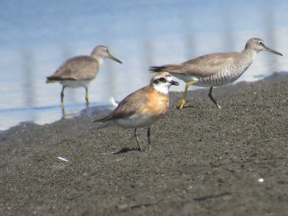 一枚目の個体は、目先と頬が褐色味があるように見え、胸の褐色部も淡い橙色で、胸の境に黒線もないように見えることから成鳥雌の夏羽から冬羽に換羽中の個体と思われました。二枚目と三枚目は、額から眉斑が白く、過眼線が褐色、上面が褐色で胸が淡い橙色の夏羽から冬羽に換羽中の個体と思われました。