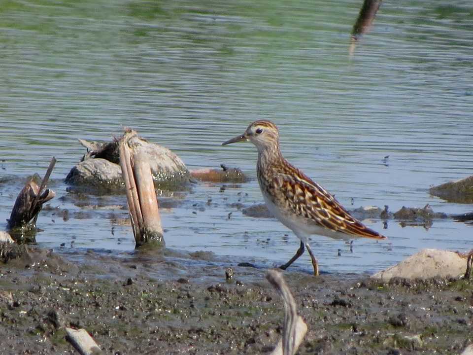 夏羽の肩羽の軸斑の黒さと羽縁の赤褐色、冬羽は頭が無斑で眉斑がなく、白い腹だけが目立つ対照的な姿でした。また、背中に2本の白帯のあるヒバリシギ若鳥の姿もすぐそばにあって暑さと時間を忘れされてくれる楽しい時間でした。