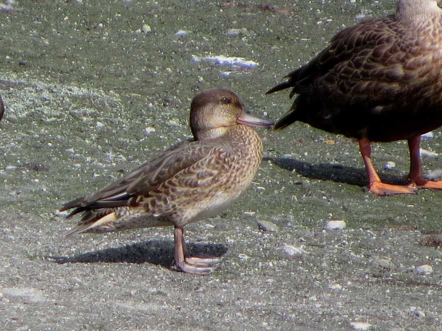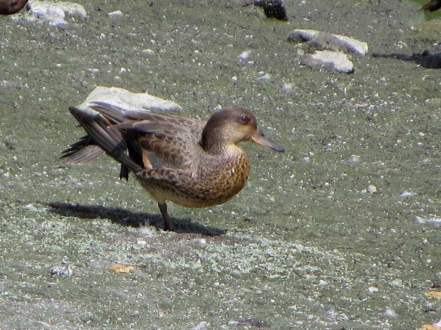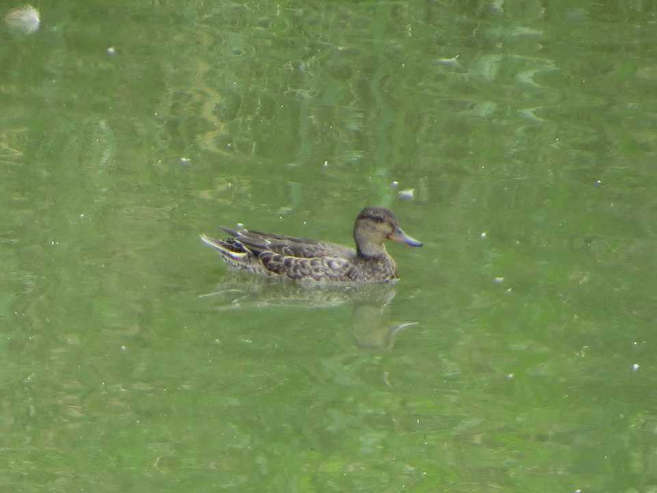 コガモは、雨覆に褐色味があり淡色の羽縁が目立つ幼羽と思われる個体、