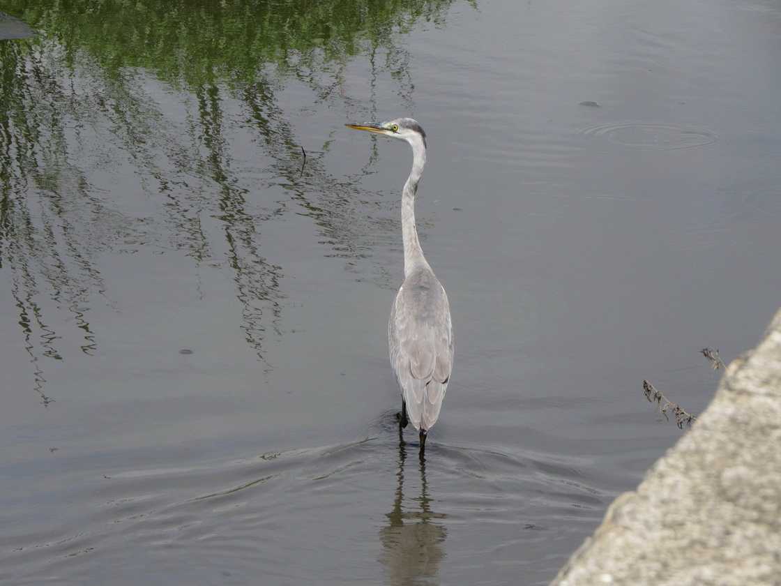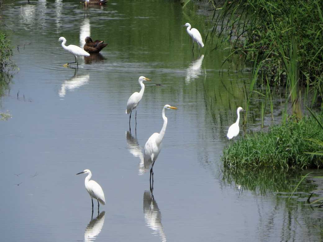 東口調整池の近くの水路には、ダイサギ、チュウサギ、コサギ、カルガモが羽をやすめていました。その光景は、吉川市に水田が広がっていた頃のような懐かしい風景でした。