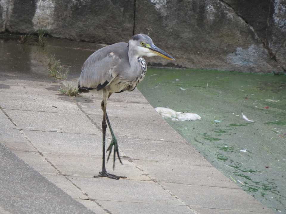 嘴が黒く上面が黒っぽい若鳥と思われる個体(写真2枚目奥の個体)、頭頂から過眼線までがヘルメットを装着したように一様に濃く見えるエクリプス個体を含む群れが水面を移動する姿を観察しました。このほか、池の岸辺をゆったりと移動していたアオサギ若鳥の姿を見つけました。