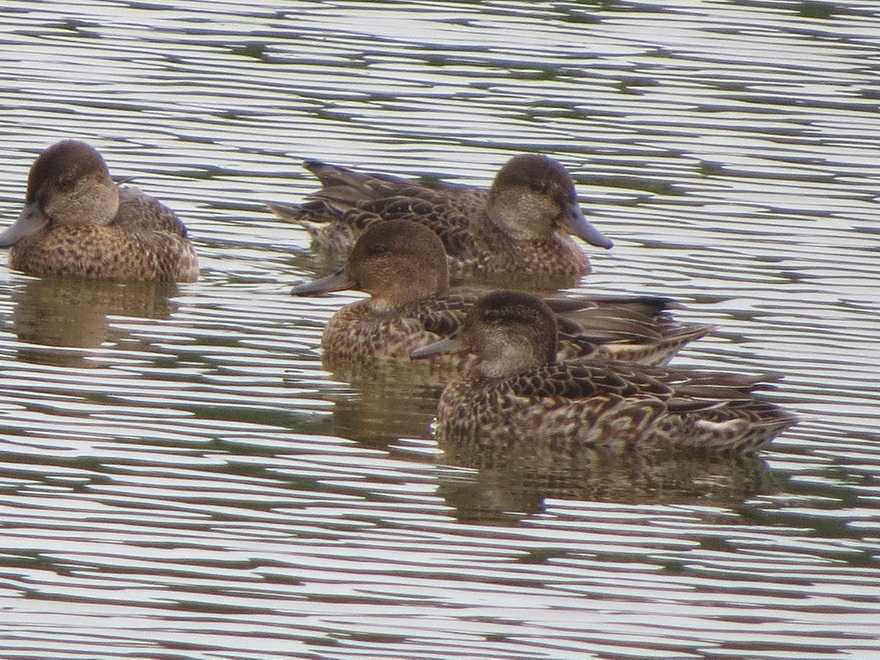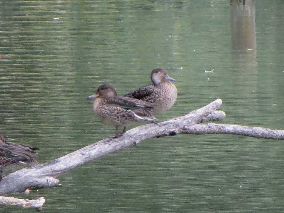 コガモは嘴基部側面に黄色味と雨覆に灰色味のある雄幼羽(写真2枚目の手前の個体)、
