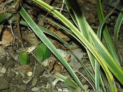 (3月9日記入)スノードロップの芽がもう出ないのかな-と探していたら(マジなさそう.....10以上あったのに3個になった(T_T))スプレンゲリーの葉が出ているのに気付いた。2月16日撮影。これ、ヒガンバナの仲間の中でも花の直後に葉が出ず、春出葉型とか言って今頃出るのです。で、花が咲くまでにはまた葉が枯れるので忍者のように注目を受けぬ間に顕われ、消える。しかし一方で大きな葉がかなり長期にガーデンを占拠するので、ガーデンプランの助けに記録を残す。んで、ついでに夏に花が咲いた姿もここに貼らせて下さい。あの頃仕事が忙しく日記更新怠りがちだった。でもこの子ウチで初花だったのよ。蕾が伸びた。手前の葉はこれの葉ではない(ヤブラン)。開花。8月9日。花弁が青みがかるのが特徴。8月12日撮影。平成15年に時期遅れの値引き球根を購入、初年はともかく16、17と不発。大きな球根に相応しく大きな鉢をあてがったつもりだったが不足だったらしい、根負けして地植えにしてやったらようやく18年開花に至る。