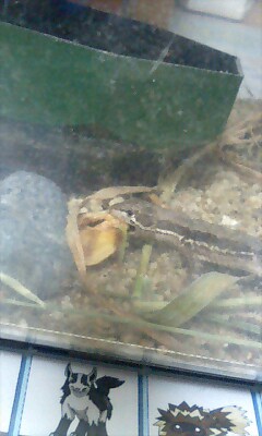 暑いです!かなり暑くて溶けますぅ~~~今年もすでに日焼けで黒くなりつつあるんですが(-゛-)そうそうまたまた新たなペットが・・・去年は昆虫系だったんですよね~な・なんと・・・カナヘビ!トカゲです・・・2号学校から持ってきちゃいました餌なんて「コオロギ」「クモ」「バッタ」なんですけど( ゚‐゚)トオイメ!食糧はどなたが持ってくるんでしょうかねぇ・・・( ゚‐゚)( ゚‐゚)( ゚‐゚)トオイメ!かわいそうに我が家に来て4日間何も食べてませんでした特怪が帰ってきた早々特怪「お~い!カナヘビの餌持ってきたぞ~」何かと思いきや・・・蛾です!食べないんじゃない?と思いきや・・・4日間も食わずだったので入れた瞬間パクッ!早っ!速攻食べてましたなぁ~んだ「蛾」も食べるんだぁ~と思い次の日もマンションに食糧さんいらっしゃったのでいただきました♪イタダキマース♪φ( ̄¬ ̄ヾ)1日置きにあげればいいみたいなのでラッキー♪しかし・・・その後から食糧さんいない・・・(ToT)またまたカナヘビ「カ~くん」お預けあまりにもかわいそうでペットショップで「コオロギ」購入しました初めてだわ!「コオロギ」買ったのなんてヾ(。`Д´。)ノ彡☆ブーブーッ!! ってかそこら辺に食糧たくさんあるだろ~に・・・10匹190円ですよ~(* ̄0 ̄)/ オ~イ!買わなきゃならんのか・・・?カ~くんの横に「コオロギ」のカゴ置いたらなんだか落ち着かないらしい(≧m≦)プッ!横でピョンピョン!跳んでるしあんまりかわいそうなので「コオロギ」は別のとこに置きました毎日みてるとなんだかかわいくなってくるよ~な・・・(= ̄∇ ̄=)寝るときなんてちゃんと「眼」とじてるし(-_-).。oOO グゥグゥ・。・。・。お水もちゃ~んと飲んでるしぃ~~慣れると手から餌食べるくらい懐くらしいですってカ~くんって言ってるけど・・・この子は♂or♀?どっちなんだろ・・・