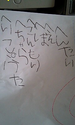 1年生の1学期は「ひらがな」を完璧に!でもって毎日ひらがなの宿題です適当に書いてるので私が付きっ切りで鬼のように教えてます。この間学校でやったプリントをまとめて持って帰ってきたんですそれ見て大爆笑字の練習して言葉を連想して書くらしいんですが・・・こんなことを書いてましたなんでへんたいが1番始めに浮かんできたのか・・・(-゛-)次はへそ、へぼへこんもりアニメのこてんこてんこに出てくるキャラへちゃら小さい「っ」抜けてるし・・・へりこぷた他には「て」でてがふくらんだ ヾ(¨;)ぉぃぉぃ!文章だし「せ」せんとうかいし「よ」ようこそあとは食べ物の名前がほとんどでした( ゚‐゚)トオイメ!なんでしょ・・・2号の頭の中はかなり笑えましたけどねぇ~~1号の時とは大違いです同じ風に育ててるんですがね~(≧▽≦)彡☆バンバン