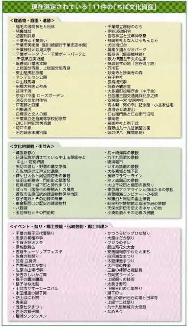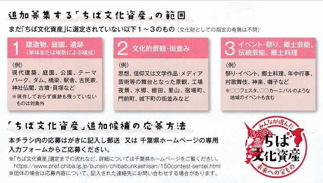 その一枚がこれ! ちば文化資産追加候補募集のチラシ。県民投票などにより2018年に千葉県の文化の中から 「次世代に残したいと思う千葉文化資産」を111件選んだ とある。